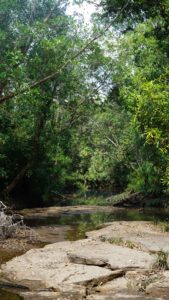 On finit par retrouver les villages, et on arrive devant une petite cascade mimi, où une famille venue en gros 4×4 pique-nique et où plusieurs moines avec leurs tenues traditionnelles orange se baignent. Puis (nous aussi on veut se baigner !), on va un peu plus loin, dans un petit coin contre la rivière qui nous rappelle un peu la Corse. Après avoir fait trempette, Kim et Sowann s’installent et lancent le feu tandis que nous trois allons avec délice nous laisser glisser dans l’eau de la rivière. Quel bonheur après deux jours à transpirer ! La vasque est grande et on nage un moment, puis Andy et Romain sortent tandis que Camille profite de chaque instant de barbotage autorisé jusqu’à ce que le repas soit prêt. Sur les arbres qui bordent la rive, elle aperçoit de nombreux oiseaux, jaunes, verts, noirs, à longue queue, et deux écureuils qui se courent après dans les branches.