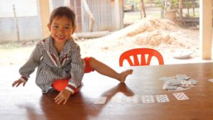Malgré ces bémols, l’expérience était super. On a choisi d’être logés en « homestay », chez l’habitant, pour 5$ la nuit : on s’est retrouvés dans la famille de Srai Phoah, la maman, sa mère Saithi, et ses deux boules de mignonneté Sinni, 4 ans, et Wayut, 7 ans. Évidemment, Camille a craqué tout de suite, et elle a passé une bonne partie de ses après midi à danser, dessiner, jouer à cache-cache ou au ballon (improvisé avec un débardeur en boule dans un mouchoir en tissu noué 😛). La petite fille Sinni était particulièrement à-cro-quer.