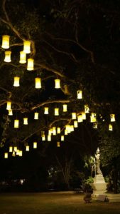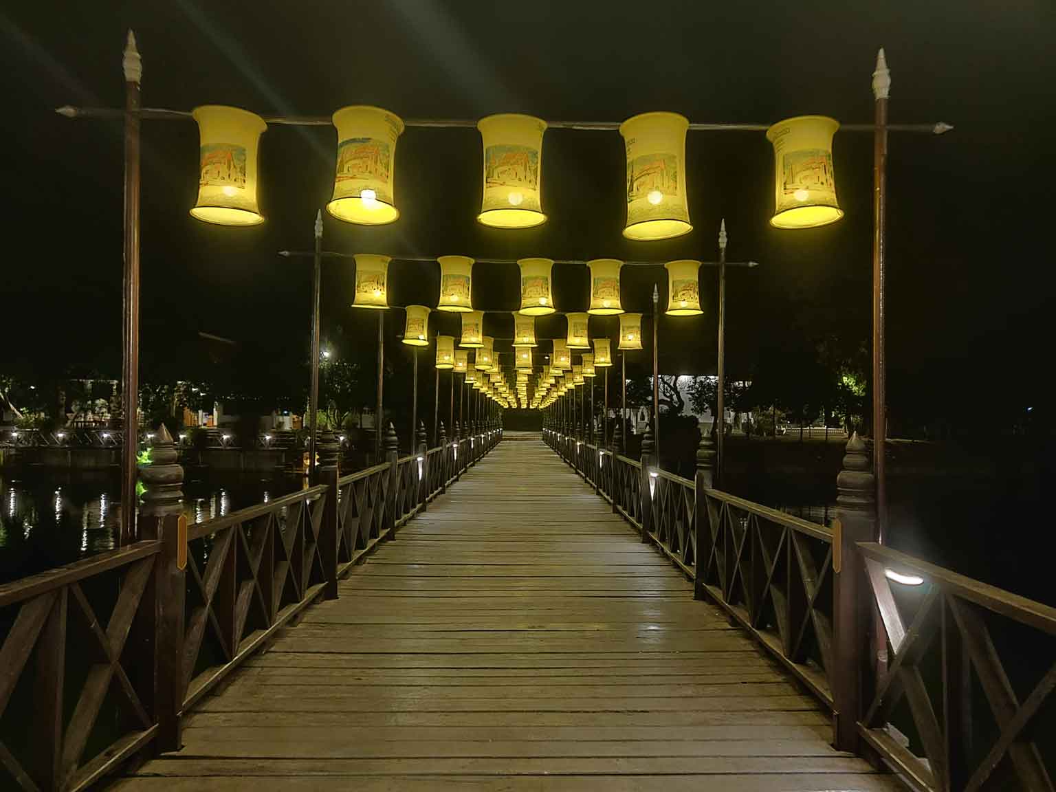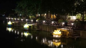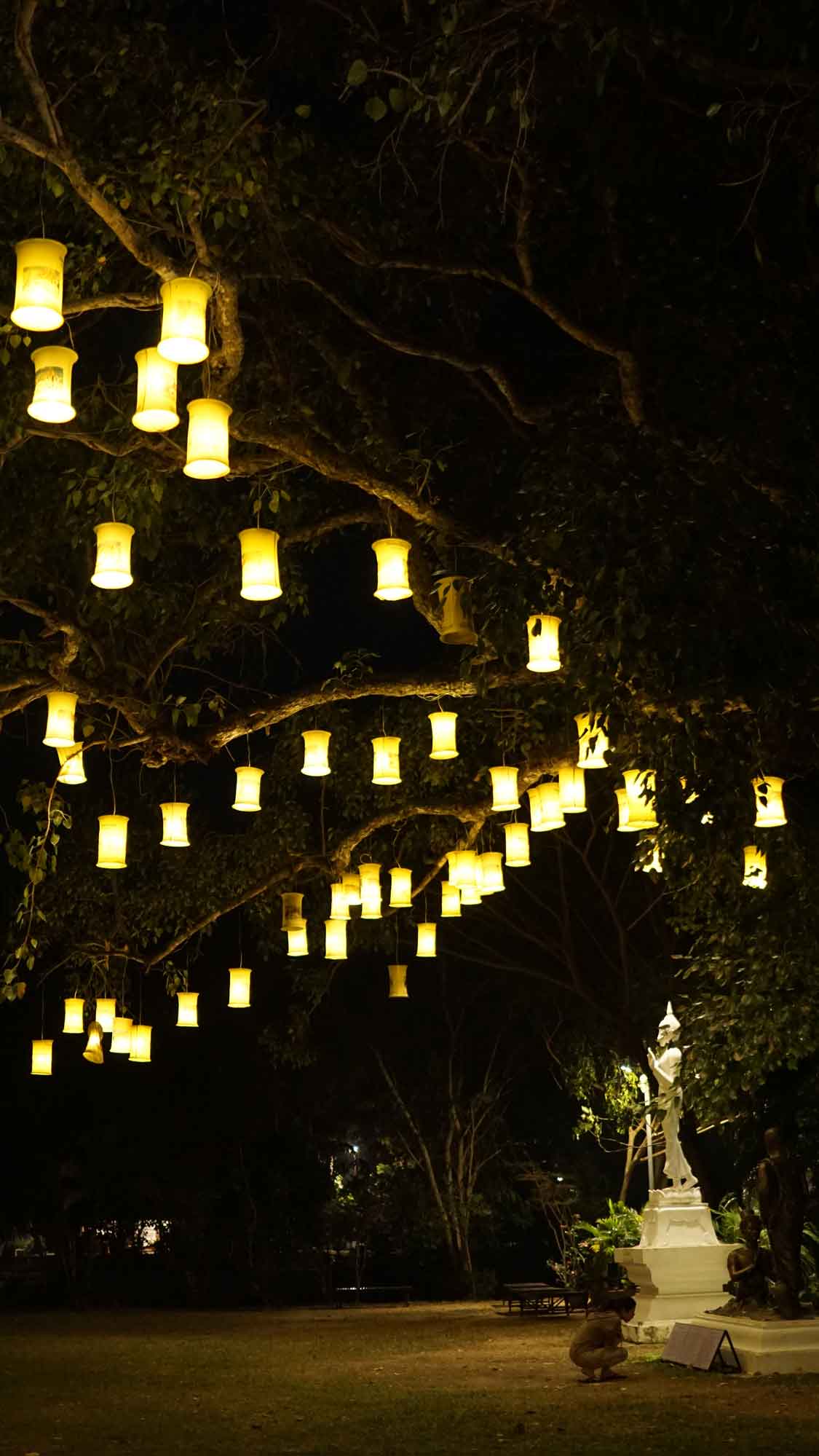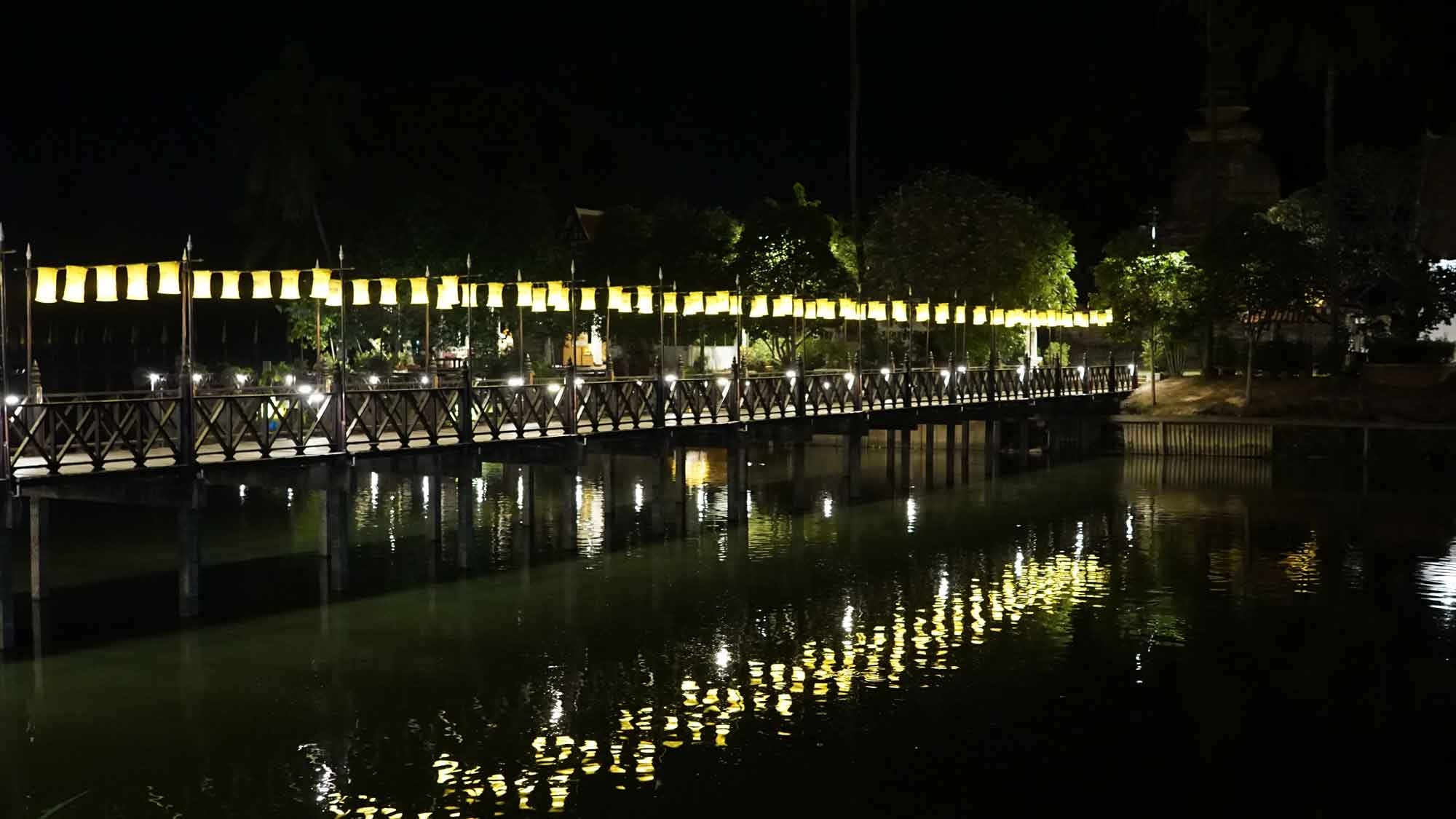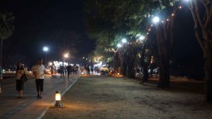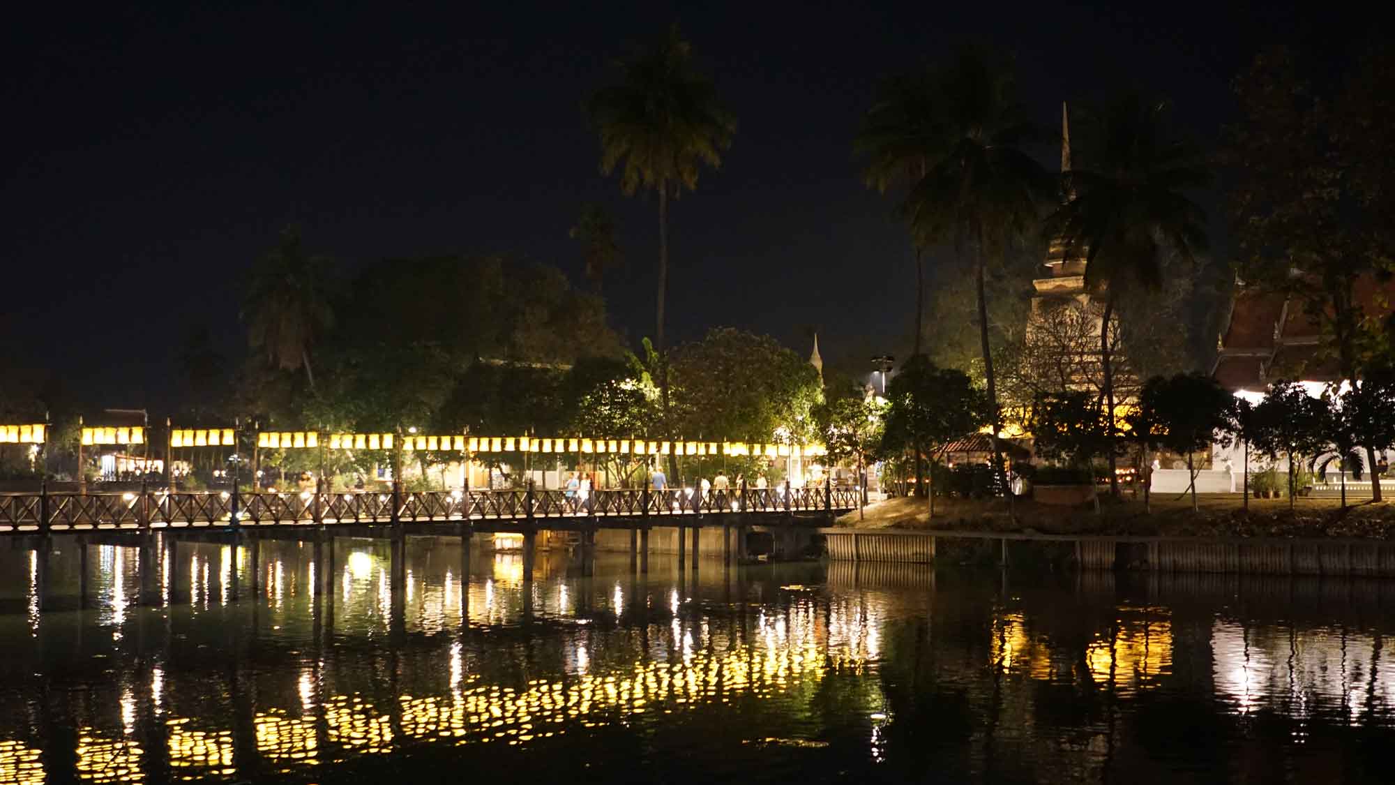 Le premier soir, on commence par un petit passage au Wat Traphang Thong, juste à côté de notre hôtel. Un pont illuminé par une myriades de lanternes de papier mène à la petite île du centre, joliment éclairée elle aussi, où on voit des statues qui racontent l’histoire du temple et de son eau sacrée qui sert à chaque couronnement d’un nouveau roi en Thaïlande. Il y a aussi les grandes bandes de tissu jaune où les gens peuvent écrire des prières, et qui sont ensuite tendues à la base des stupas. La fête de la pleine lune ayant lieu le lendemain, on voit les traces de l’organisation qui se prépare…