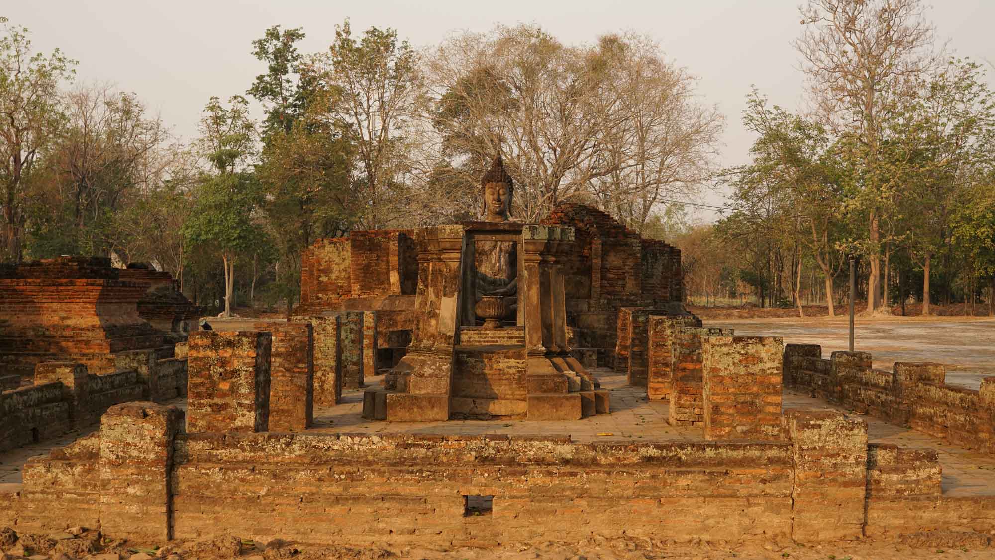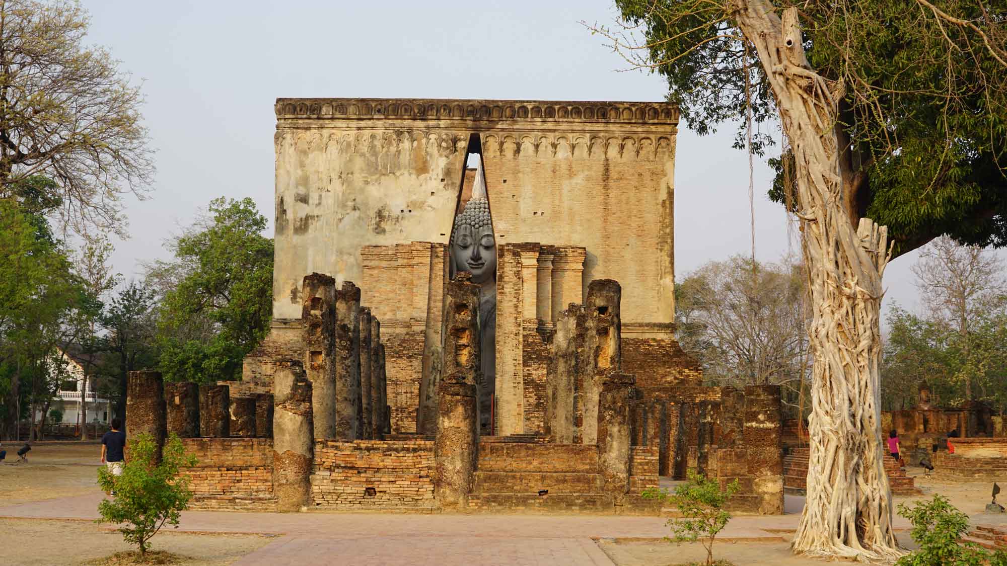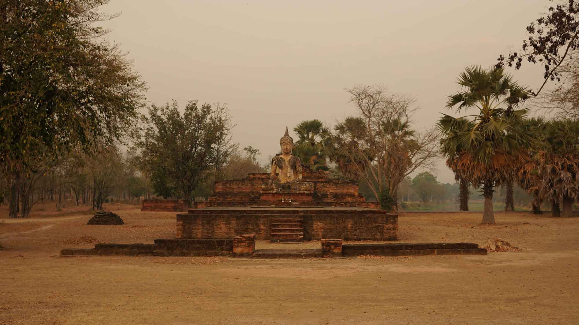 Le lendemain matin, nous partons tous les deux vers 7h pour visiter la zone du nord. Les temples sont en moins bon état mais c’est sympa quand même, entre les éléphants du Wat Sorasak, le lever du soleil au Wat Phra Pai Luang et surtout le grand Bouddha caché du Wat Si Chum. 😶