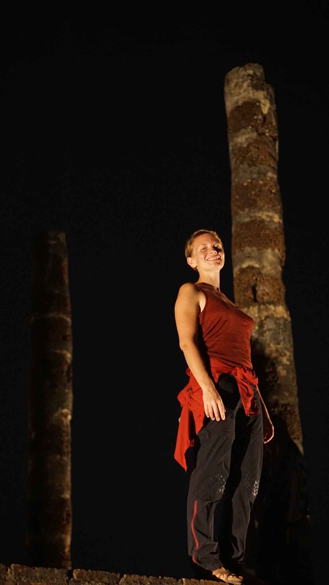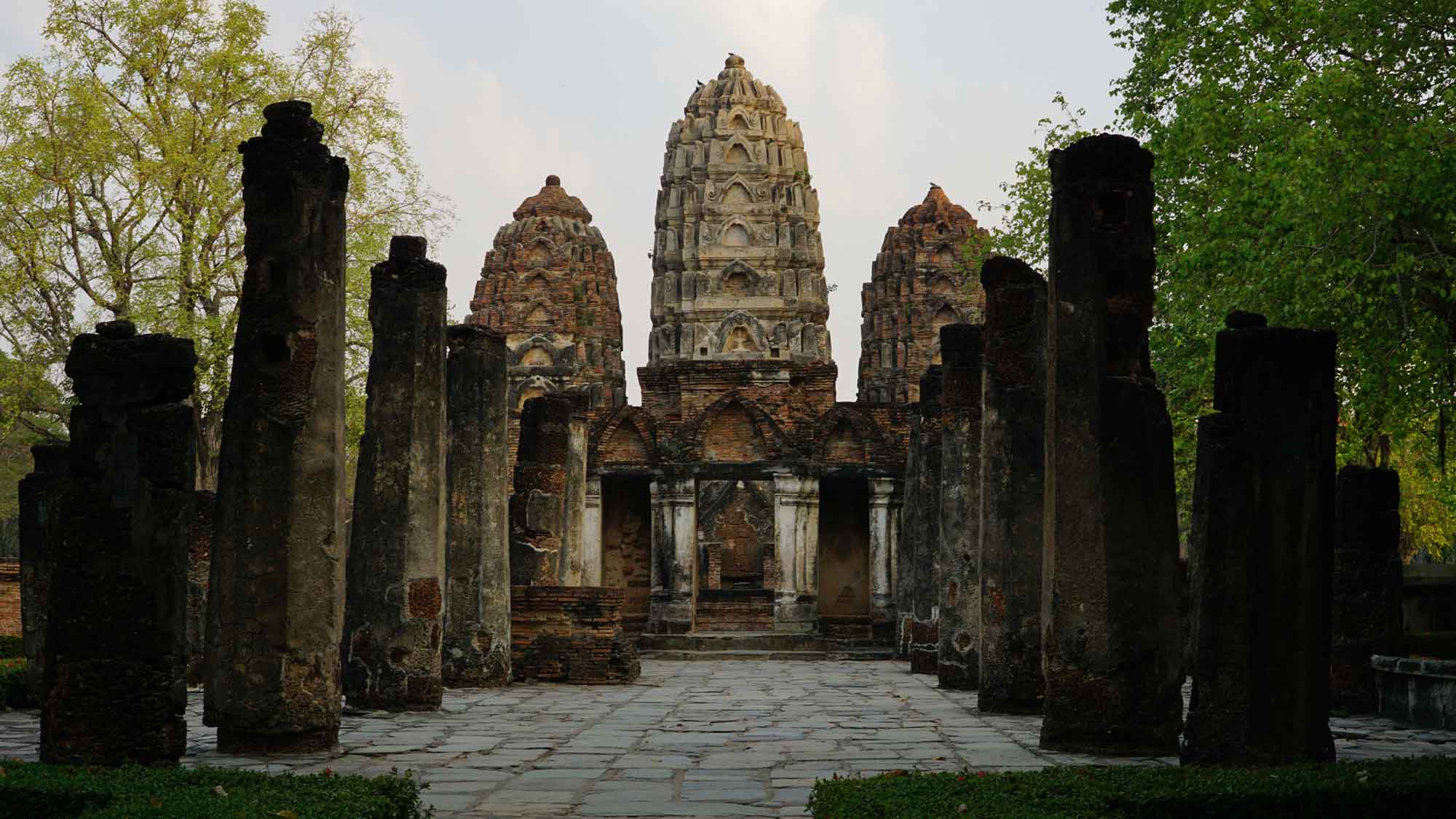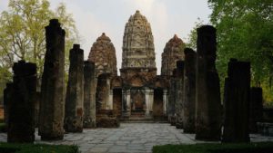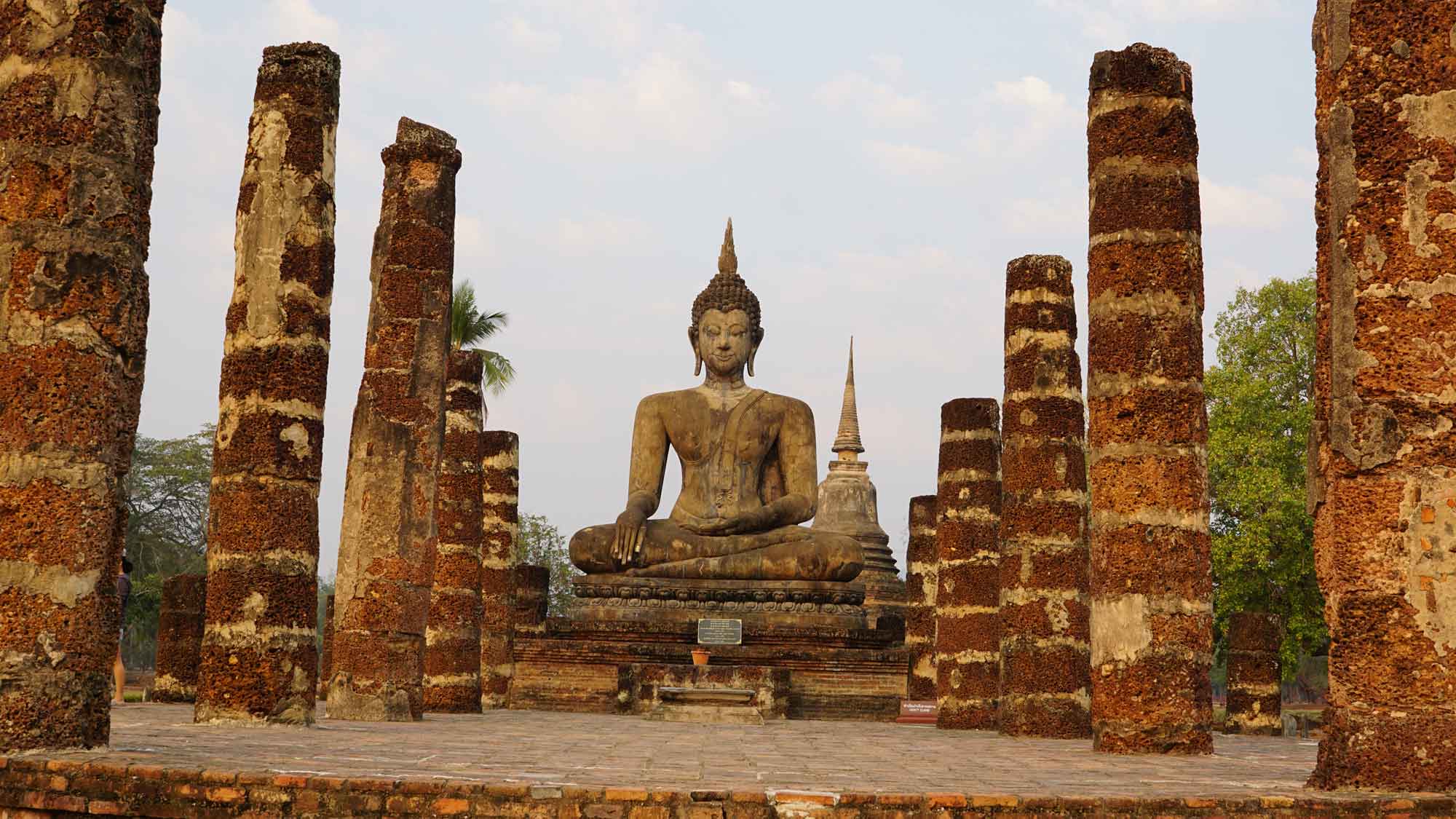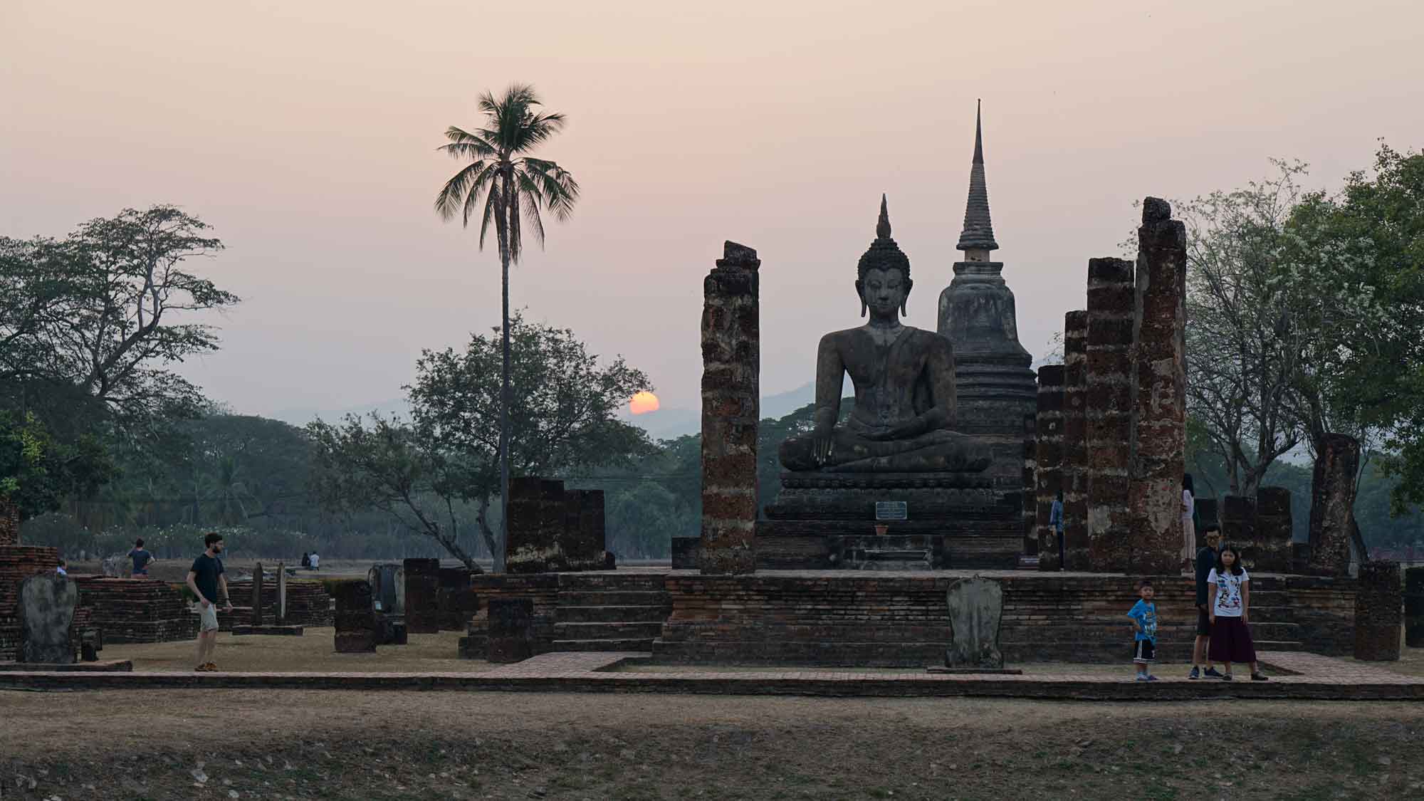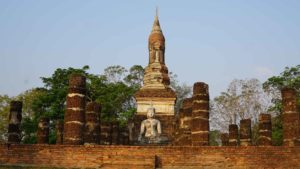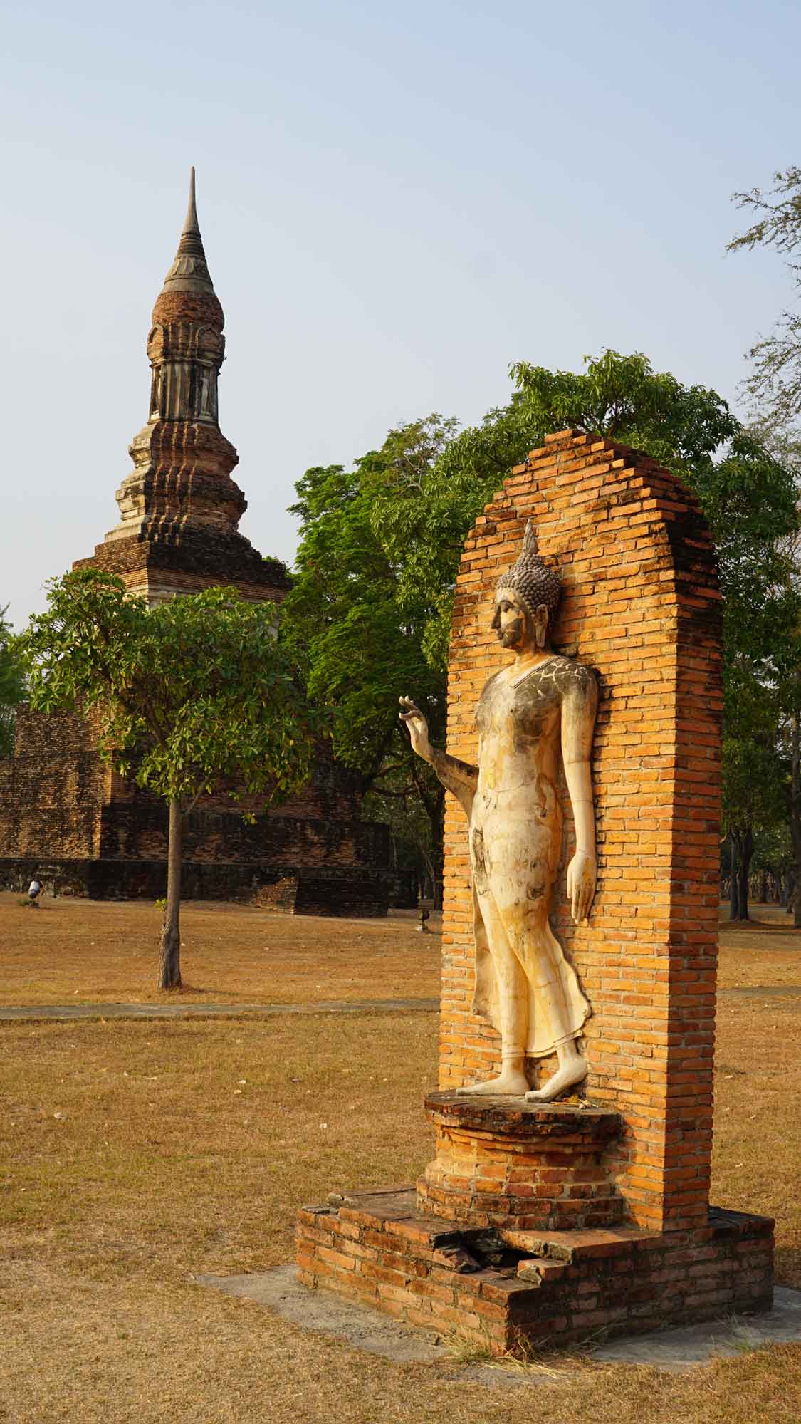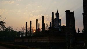 Elle commence par le temple le plus connu, Wat Maha That (le même nom qu’à Ayutthaya), et en tombe complètement amoureuse. L’architecture du bâtiment central qui ressemble à un château, les colonnes à demi-effondrées, les stupas, et surtout les statues de bouddha qui veillent le temple et créent une atmosphère mystique et apaisante. Le lever du soleil entre les colonnes vient couronner le tout, l’ambiance est magique.