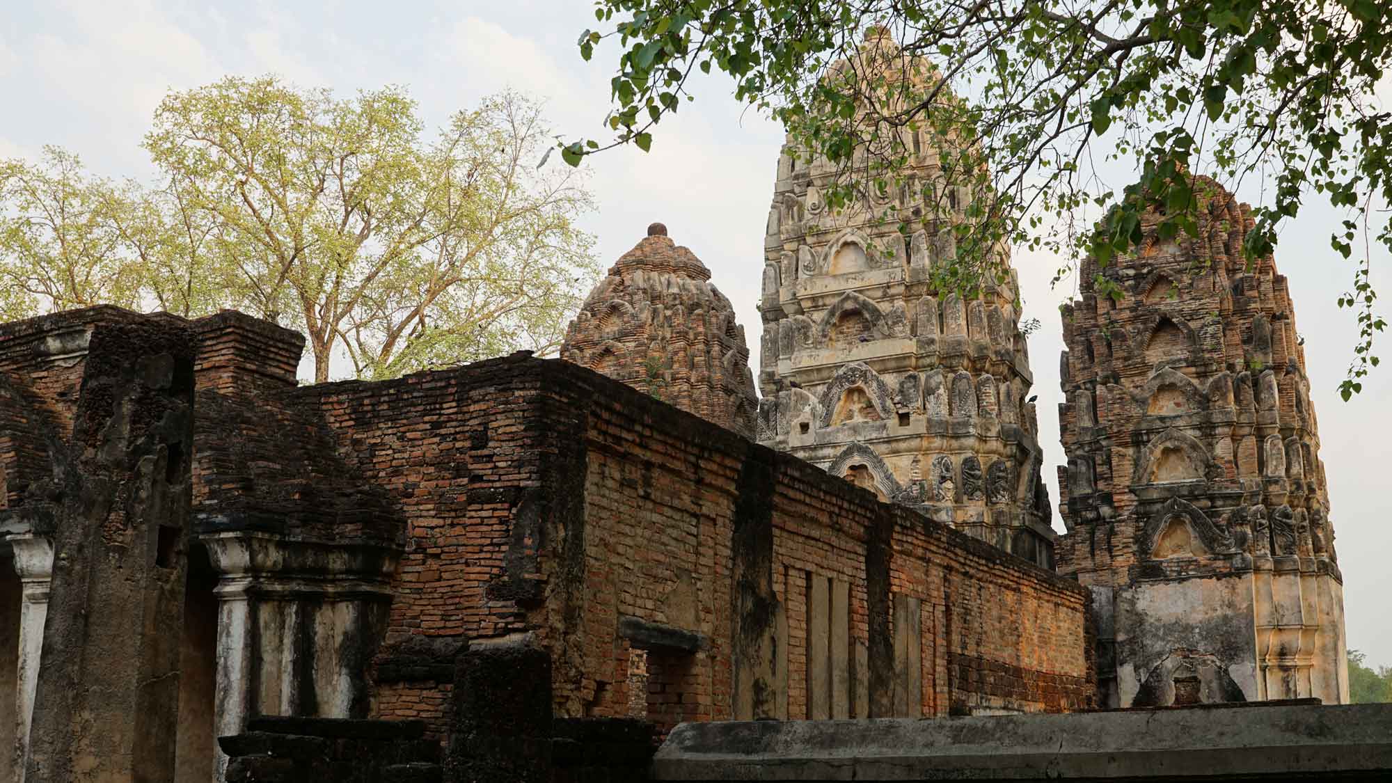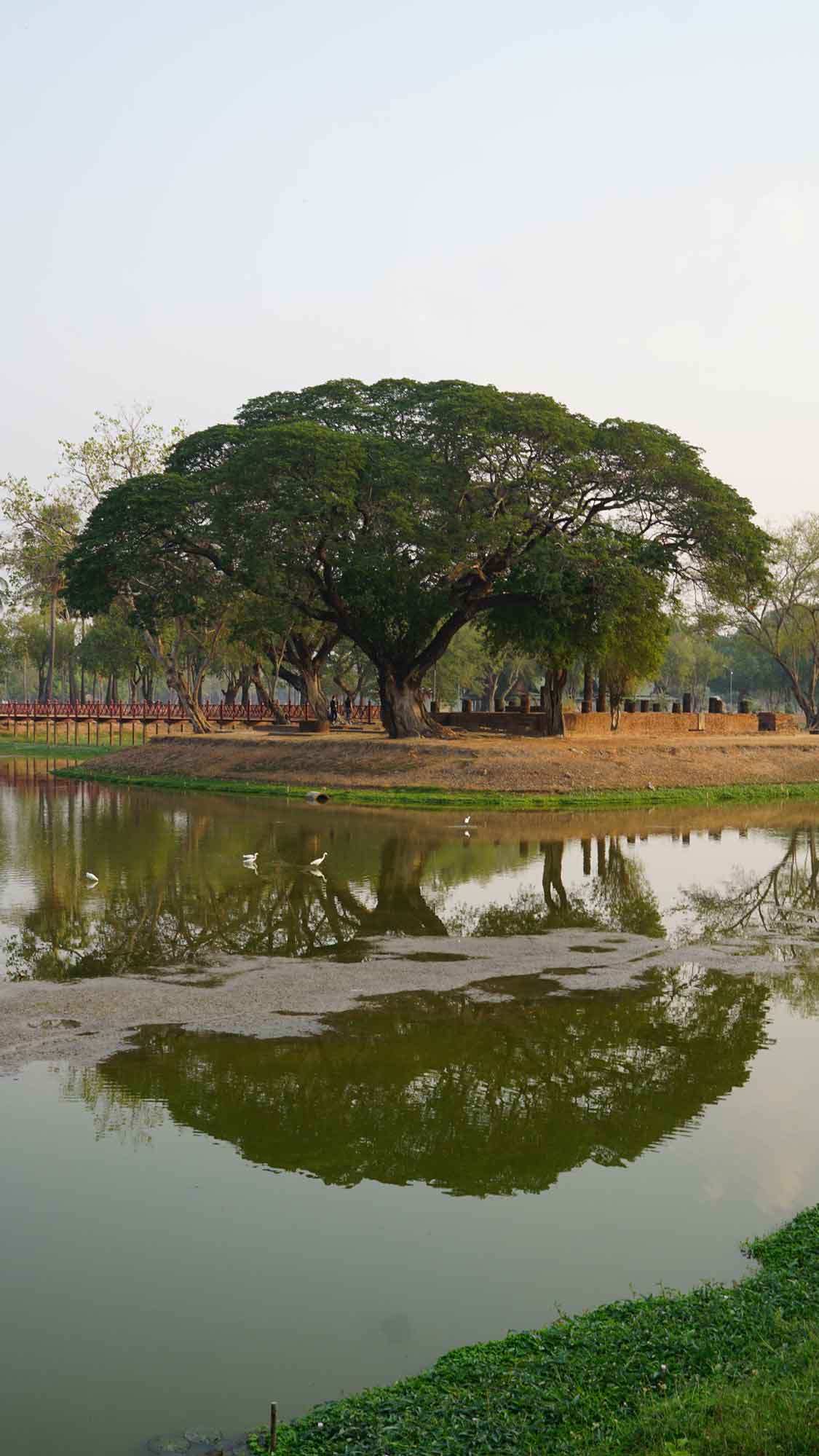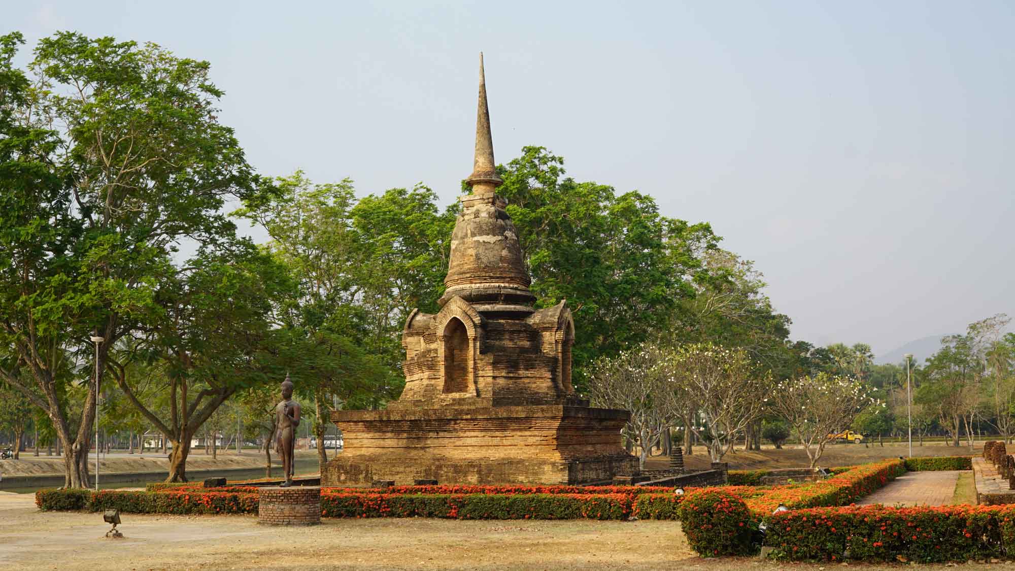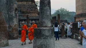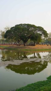 Ensuite vient le temple Wat Si Sawai avec ses trois dômes qui ressemblent à ceux d’Angkor, puis le Wat Traphang Ngoen qui se reflète dans le vaste plan d’eau au centre du parc où planent des oiseaux, sortes de petits hérons, et même deux cigognes ; le Wat Sra Sri et ses buissons taillés aux petites fleurs rouges, et le Chana Songkhram, pour finir avec le monument au roi. Beaucoup de gens sont à vélo, mais la balade à pied est vraiment agréable tant que le soleil n’est pas trop haut.