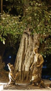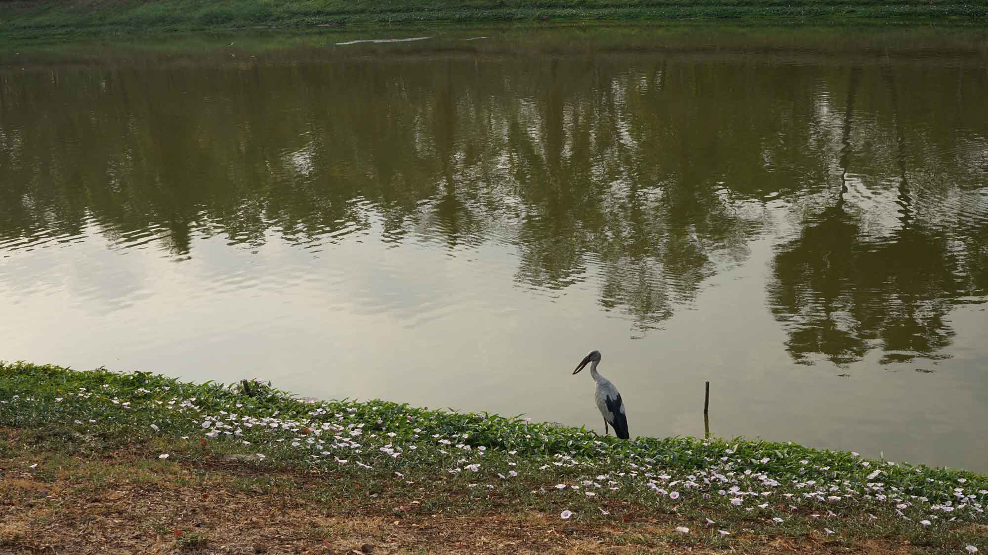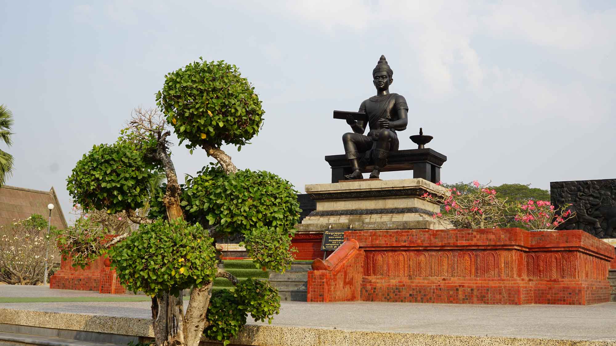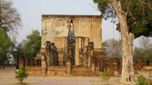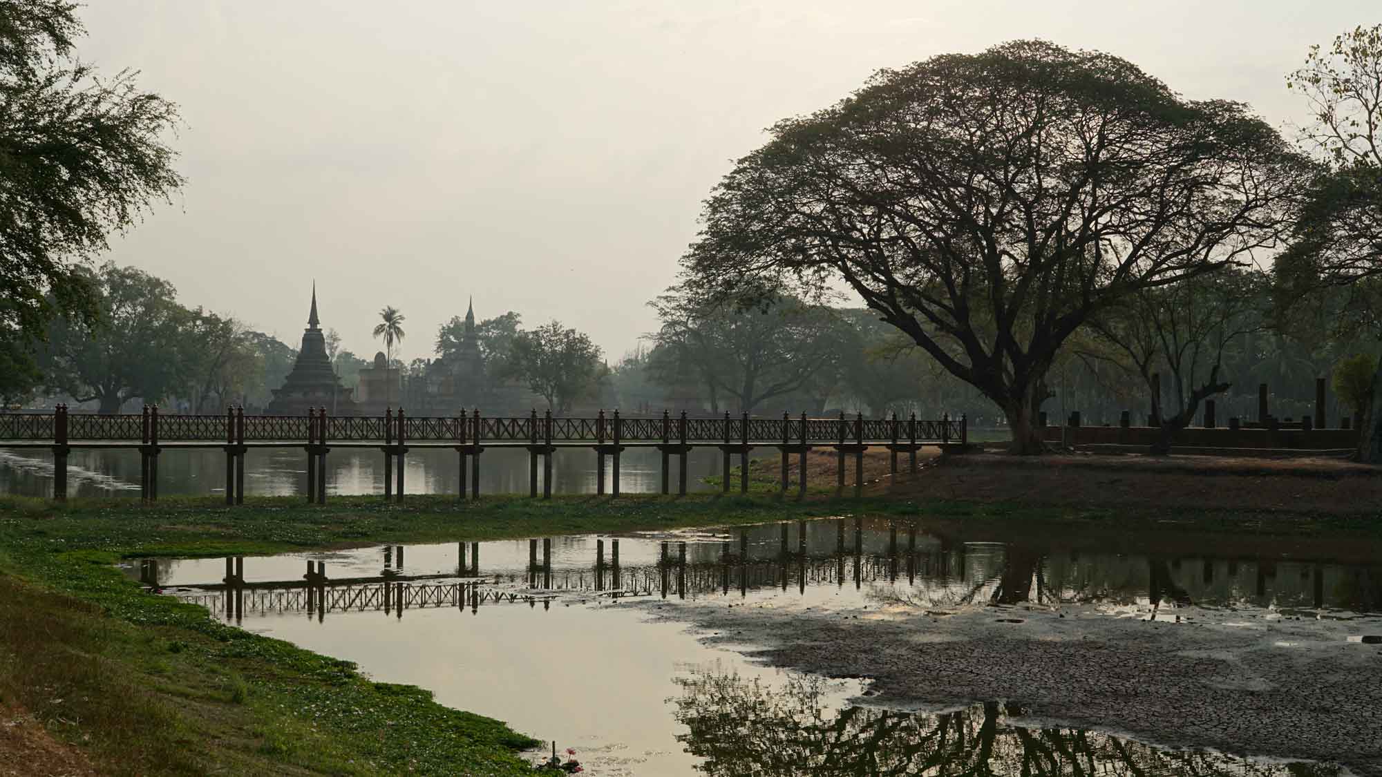 Ensuite vient le temple Wat Si Sawai avec ses trois dômes qui ressemblent à ceux d’Angkor, puis le Wat Traphang Ngoen qui se reflète dans le vaste plan d’eau au centre du parc où planent des oiseaux, sortes de petits hérons, et même deux cigognes ; le Wat Sra Sri et ses buissons taillés aux petites fleurs rouges, et le Chana Songkhram, pour finir avec le monument au roi. Beaucoup de gens sont à vélo, mais la balade à pied est vraiment agréable tant que le soleil n’est pas trop haut.