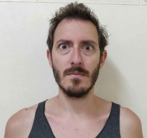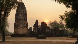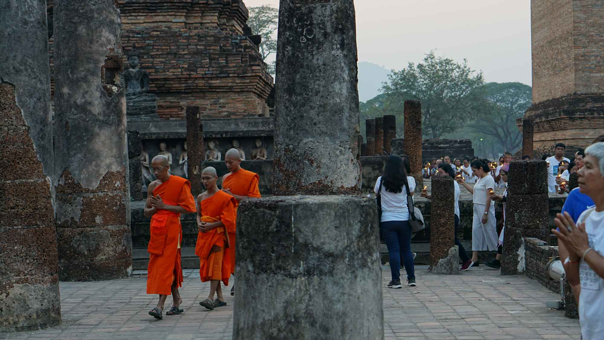 On reste ensuite bien au frais jusqu’à 18h, puis Romain prend enfin son petit ticket d’entrée pour aller profiter du coucher de soleil sur le Wat Maha That (le chouchou de Camille). On assiste à une sorte de cérémonie à l’occasion de la fête de la pleine lune : au son d’une psalmodie (qui sort d’une enceinte bluetooth, il faut le reconnaître 😉), une procession menée par trois moines fait le tour du temple en portant de petites bougies. À la fin, elles seront déposées tout autour du bâtiment.