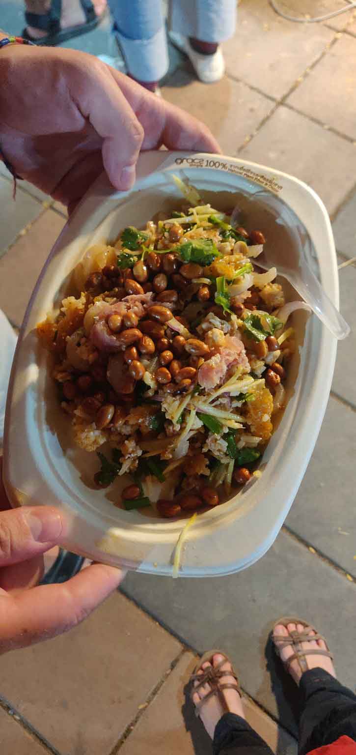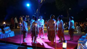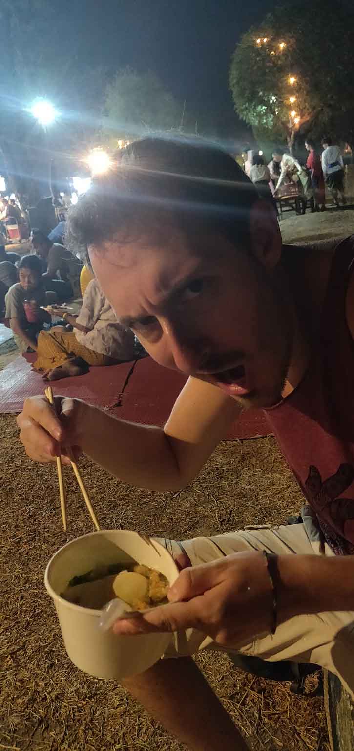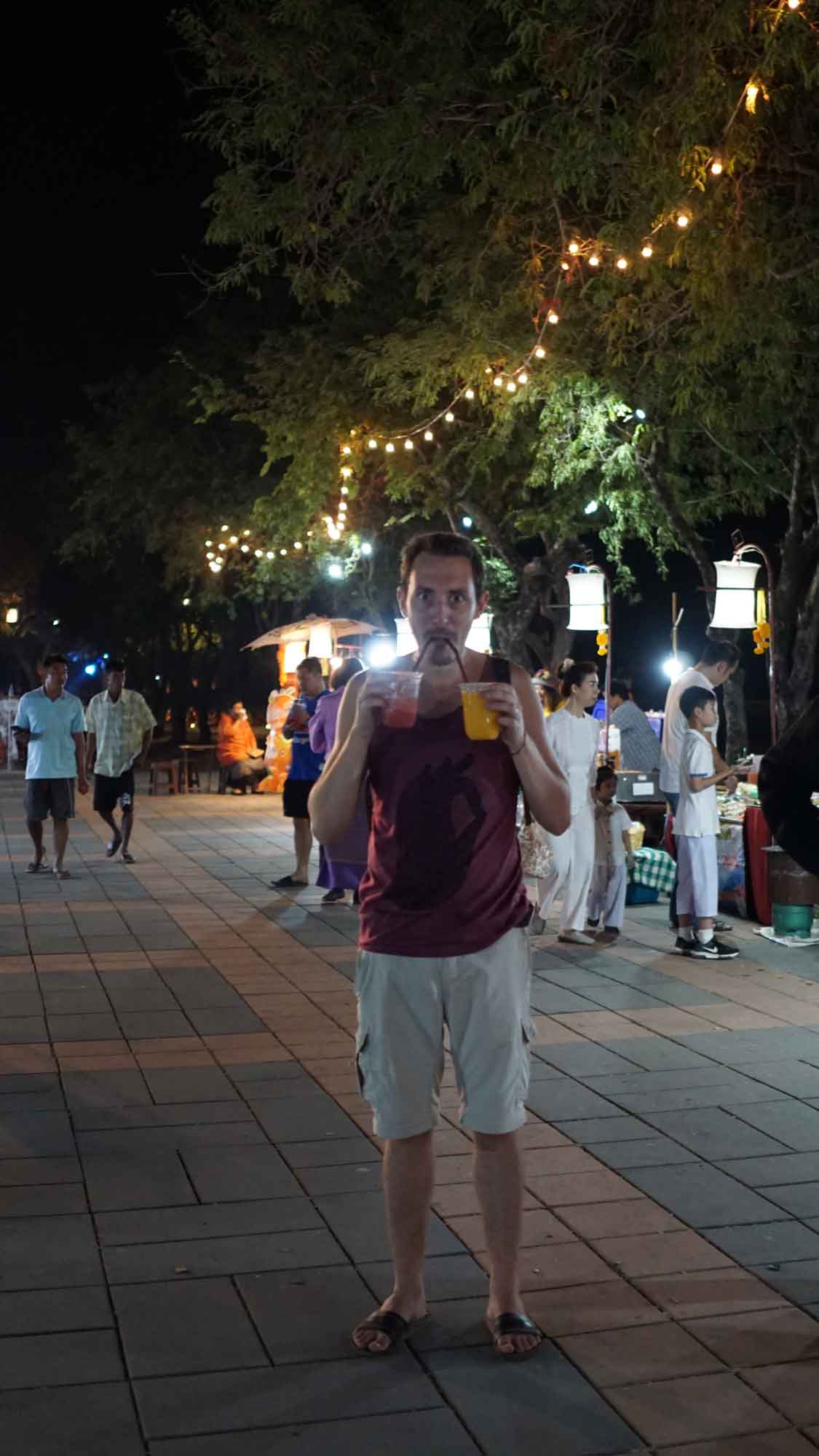 Il est 19h, et il fait faim ! On va se régaler au night market, assez original puisqu’il est dans l’enceinte même de la zone des temples 🙂. Au début de l’allée, il y a un petit groupe de femmes d’une cinquantaine d’années qui reproduit une danse traditionnelle devant des étudiants. Lorsqu’elles ont fini, plusieurs personnes, dont des moines, font des discours. On n’a pas vraiment compris quelle était l’occasion (une remise de diplômes peut-être ?) mais c’est sympa.