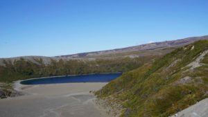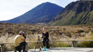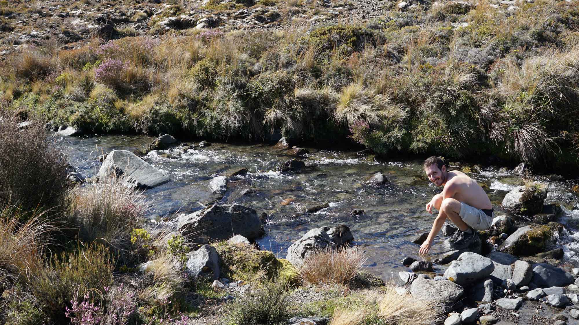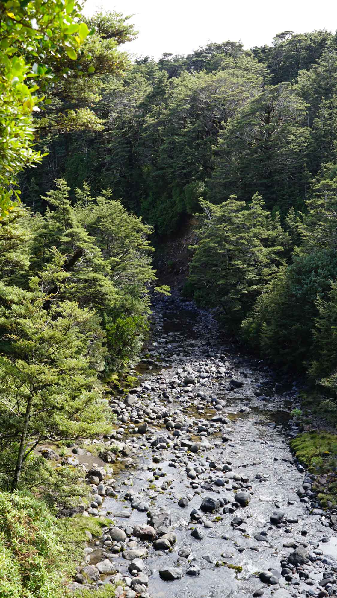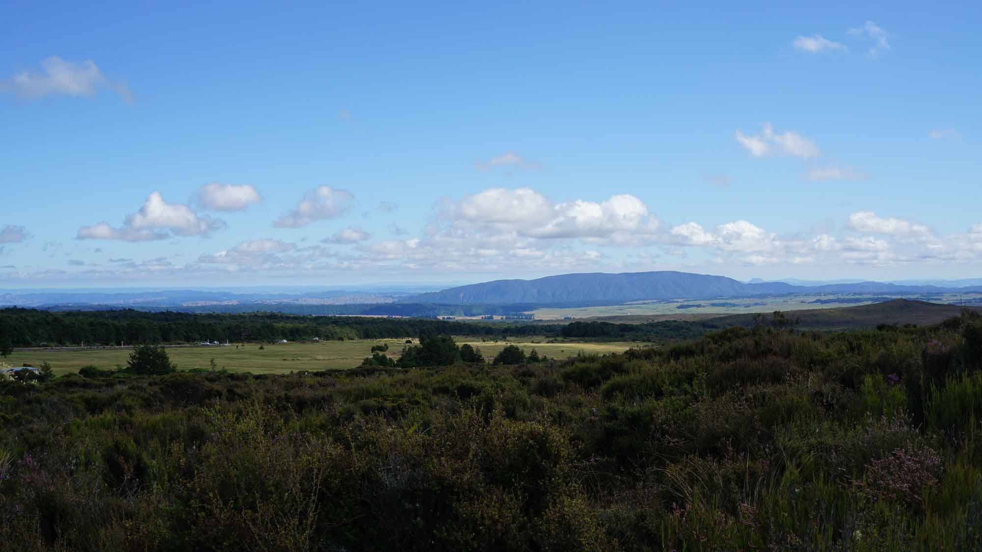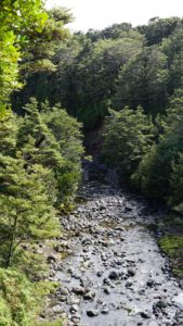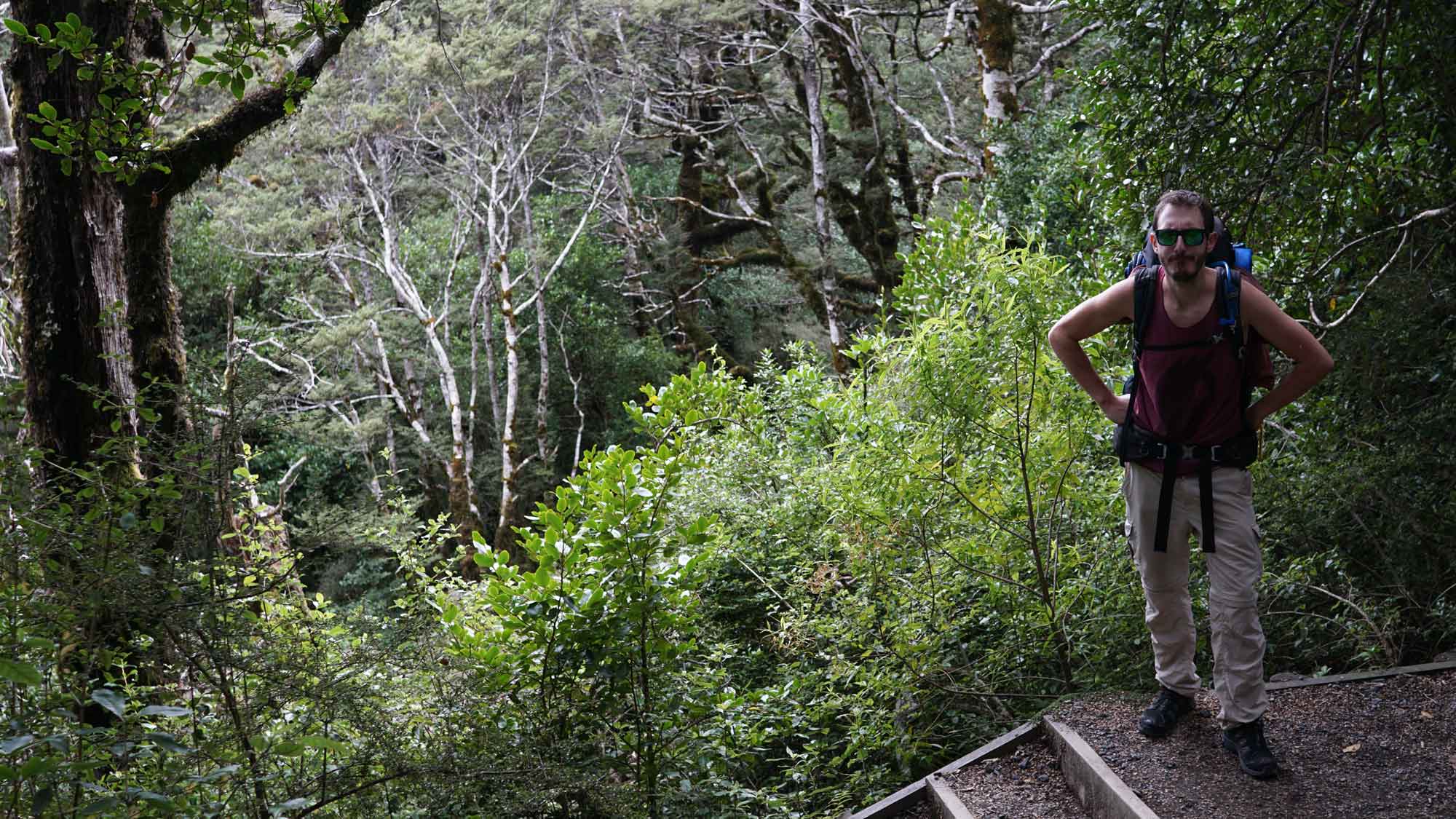 Le lendemain matin, le photographe, apprenant que Camille est chanteuse, lui propose de la filmer pour insérer une de ses chansons dans le documentaire qu’il est en train de tourner sur les randonnées de Nouvelle-Zélande 🙂. Petit moment tournage donc, puis on termine les affaires et on se remet en route, selon la tradition, à 11h 😛. Le paysage est moins changeant pour cette dernière partie : steppes, petits arbustes, et la vue qui se libère doucement sur le paysage du reste du parc national, avant de retrouver notre jolie forêt du départ.