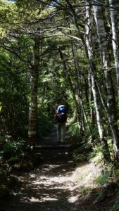 On entre ensuite dans une jolie forêt, là où le chemin se sépare entre le sens normal de la boucle et le nôtre. On croise plusieurs promeneurs, et une fille avec un énorme sac, très probablement en train de finir son circuit de quatre jours, avec l’air absolument ravi d’arriver. 😁