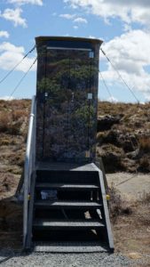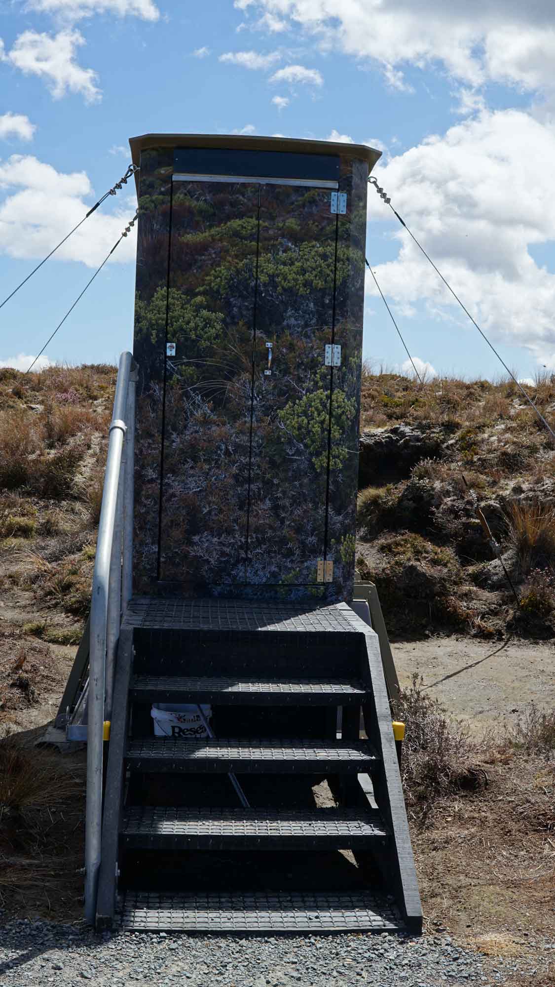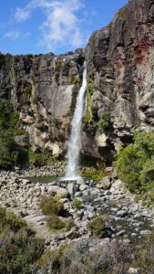 La voie débouche ensuite sur une cascade, avec encore un peu de monde : couples plus âgés ou avec des enfants, qui font des petites balades de deux heures autour du centre visiteur. Première photo avec la vue sur le reste du parc national en dessous. Ensuite, on fait un petit crochet au Lower lake où on mange nos sandwichs, puis un premier arrêt aux toilettes mythiques du Tongariro dont les murs sont couverts de photos de nature pour le camoufler. 😊