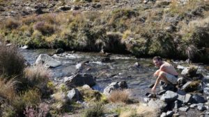 Après une dernière station toilettes, on continue, le long d’une rivière chaude, avec la végétation qui reprend ses droits, notamment de très jolies fleurs violettes. On arrive fourbus mais ravis à 18h30 au dernier refuge, où la ranger nous accueille avant de faire un petit speech pour raconter aux autres randonneurs ce qui les attend le lendemain… et qu’on vient de faire. Apparemment le temps se gâte un peu pour eux au sommet le matin, donc elle conseille de ne pas partir trop tôt le lendemain. Romain blague en leur disant que ça va être horrible mais ils ne lui en veulent pas, l’ambiance est très bon enfant, et on se dit que ça aurait été chouette, de faire le parcours comme ça, avec des gens qu’on retrouve tous les soirs aux refuges successifs. 🙂