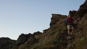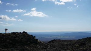 Après avoir admiré la vue, on regarde sur l’application de randonnée Maps.Me combien de temps il reste… Encore deux heures ! On se serait bien posés là nous 😛. Mais le refuge est très loin en contre-bas, donc on repart. On descend d’abord un chemin un peu raide où on croise un photographe et un sportif, très peu chargé, qui fait la montée… en courant. Bande de malades. Puis on arrive au fond du cratère, plat sur deux kilomètres, avant de déboucher de l’autre côté pour continuer la descente avec le Devil’s Staircase (Escalier du Diable) : une alternance de piste et d’escaliers qui doit être bien horrible dans l’autre sens. Nous ça va. 😊