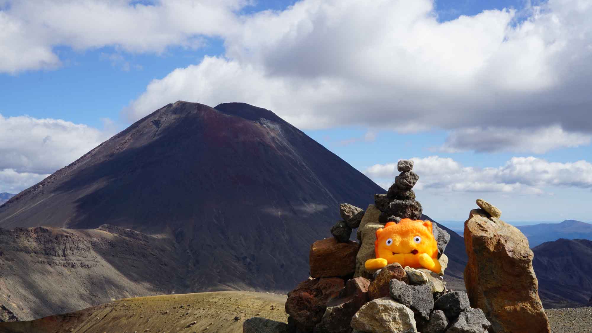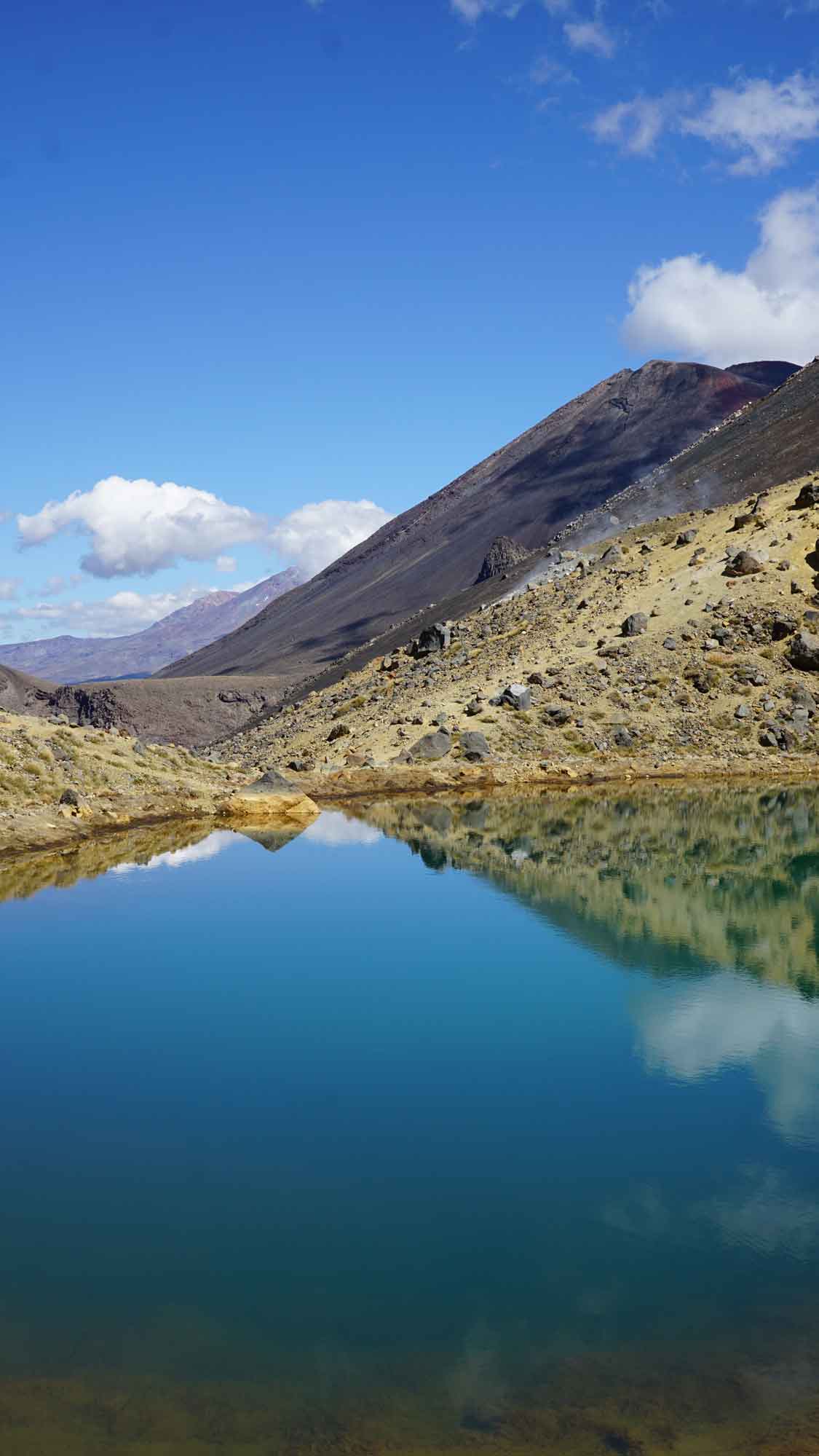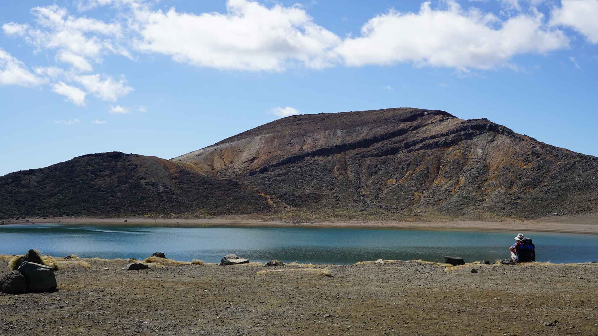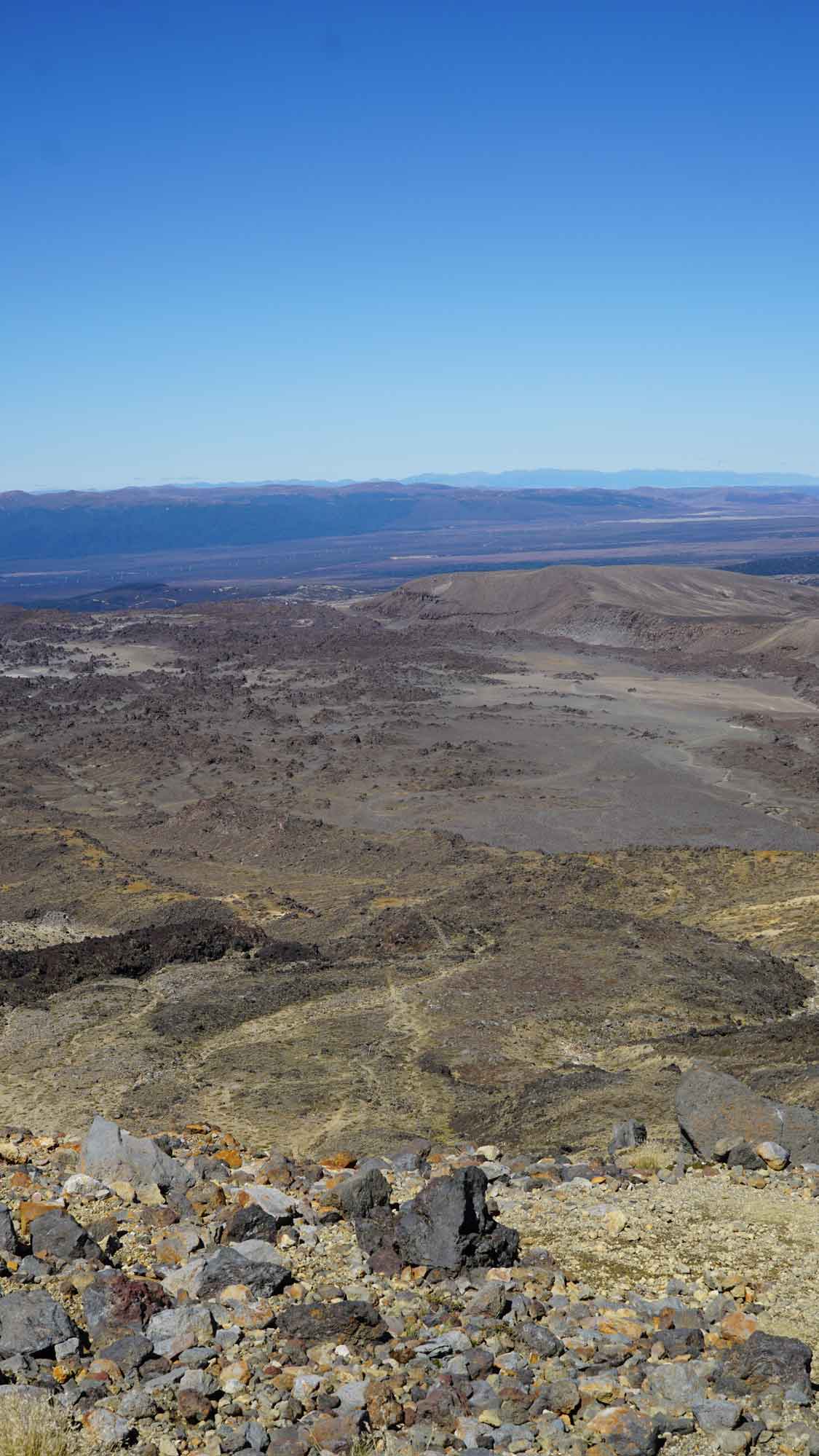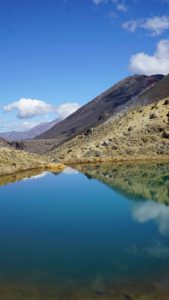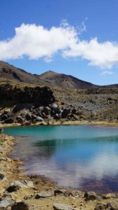 Une vue à 360° nous attend, avec le volcan, les trois lacs dont le Green Lake qu’on a passé en montant, le Blue lake au loin, le Red Crater et le Mont Ngauruhoe, plus proche que jamais. C’est de là que partait le sentier pour grimper sur le volcan, mais qui est interdit depuis 2017 car c’est un sacrilège pour les maori, dont le volcan est une divinité. On ne l’aurait de toute façon pas tenté, ça a l’air atroce 😛. Le vent souffle, mais le ciel est bleu avec quelques nuages histoire de faire la déco. 🙂