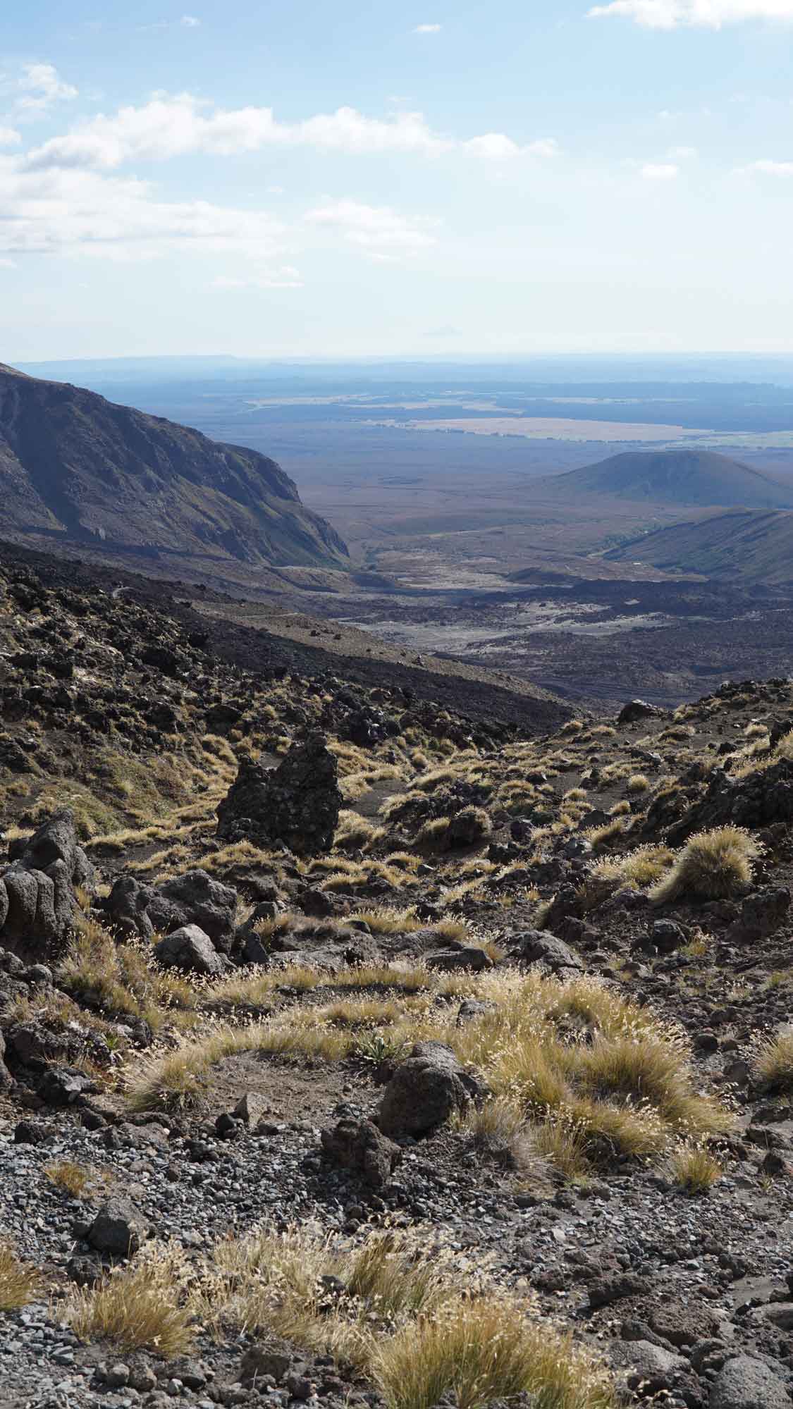 C’est parti pour la balade. Le paysage est très varié : le chemin commence au milieu de buissons, avec vue sur le Ngauruhoe, le « volcan du Mordor » autour duquel on va décrire une boucle, sommet sacré pour les Maori. Très souvent, on suit un chemin en bois (comme on avait vu en Asie), qui rend la marche bien plus simple). La météo est idéale, d’ailleurs Romain qui l’a sous-estimée s’est tapé un coup de soleil monstrueux sur les épaules. 😅