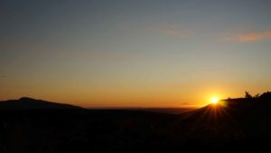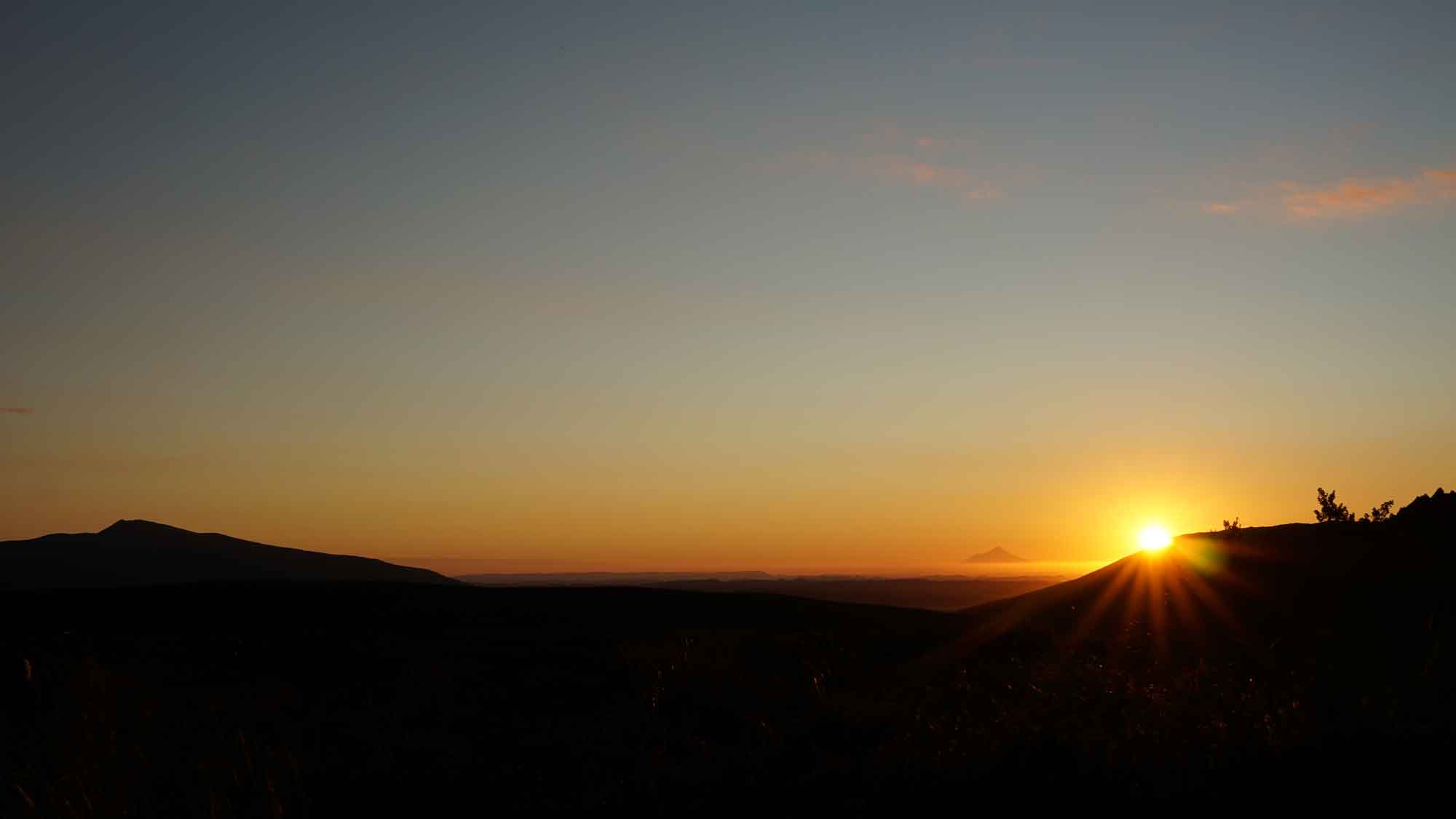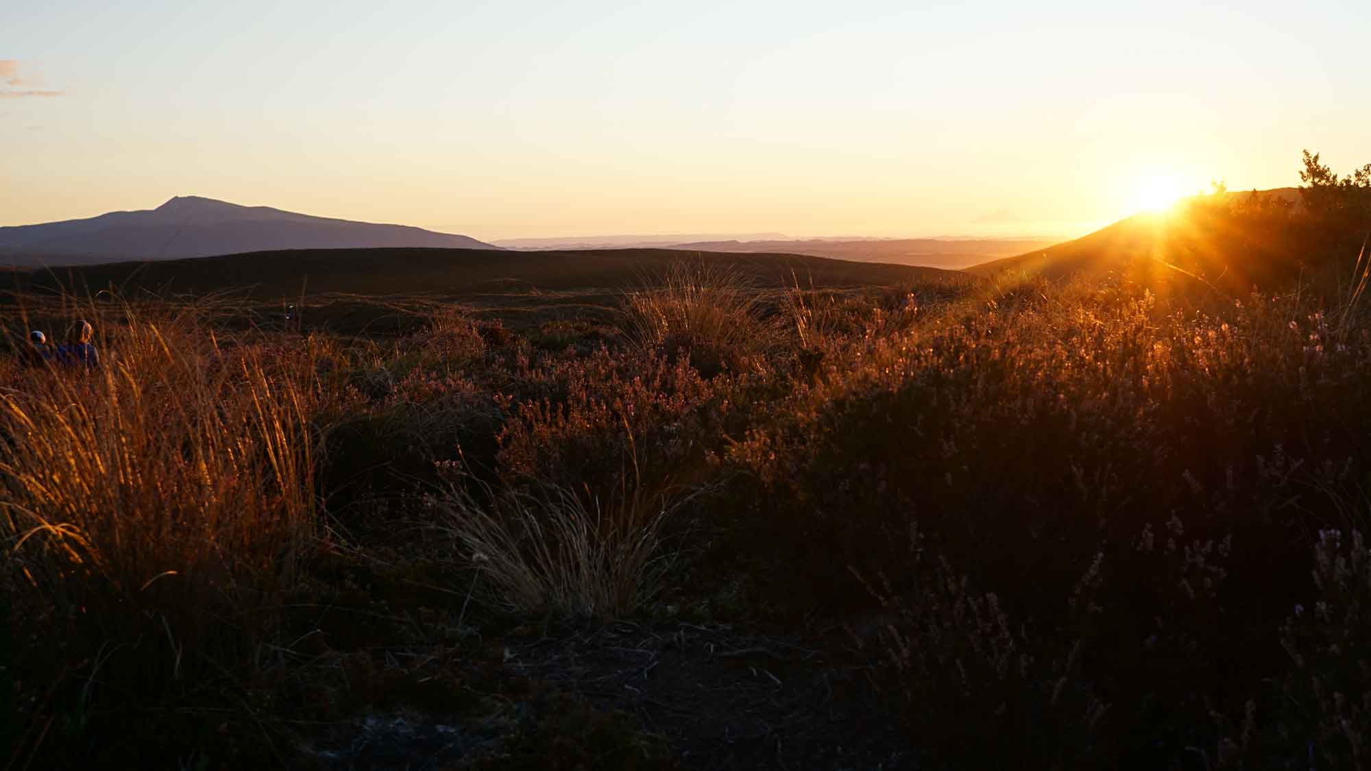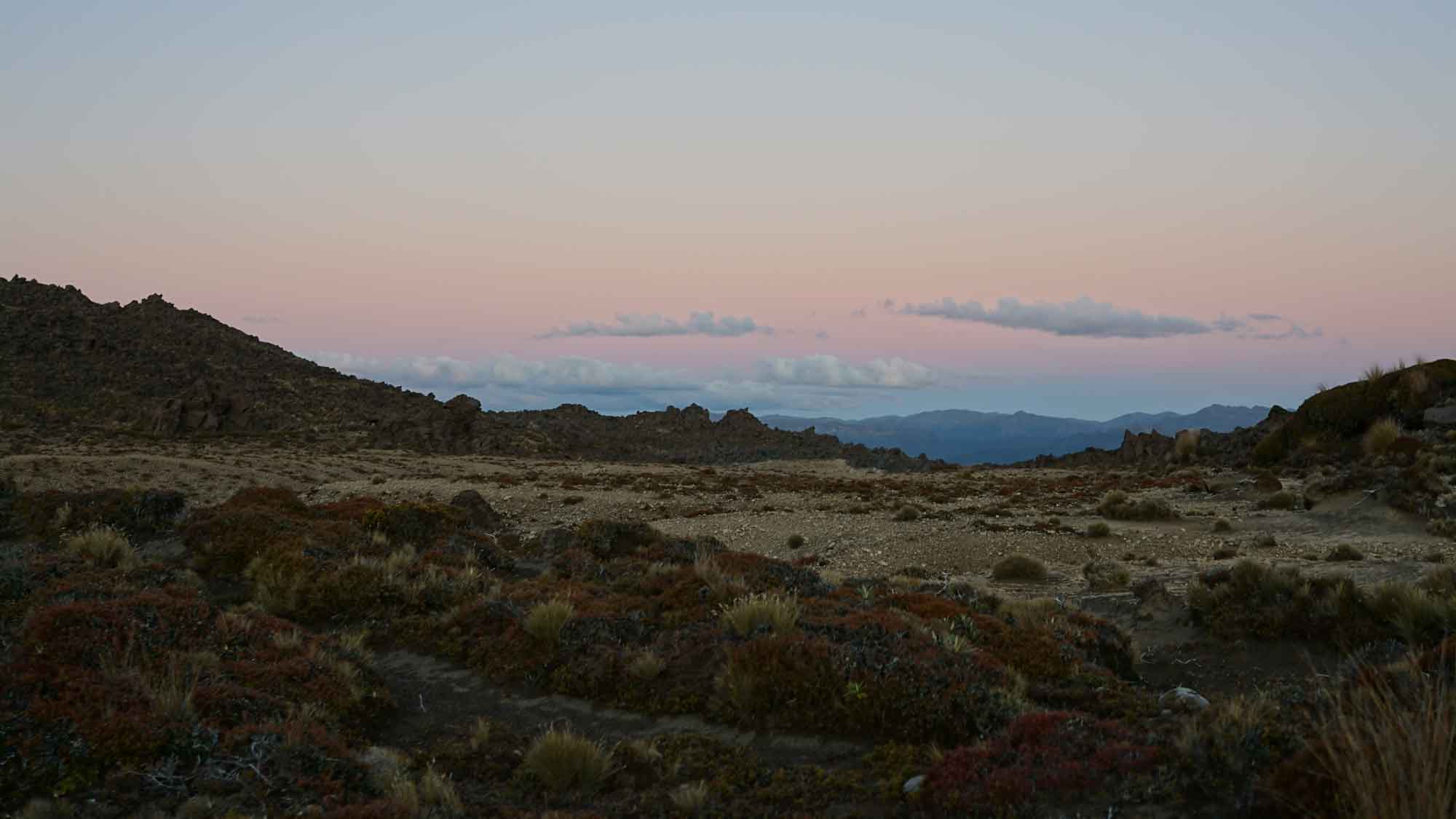 Cette fois, on a eu le temps de s’installer et de manger, et Camille peut profiter du magnifique coucher de soleil sur la vallée, avec vue au loin sur le mont Taranaki (retenez ce nom, vous en entendrez parler de nouveau…). Avant de se coucher, on discute un peu avec le photographe japonais croisé plus tôt, un couple de néerlandais et une singapourienne venue en solo. Ils ont tous l’air très sympa, dommage qu’on n’ait pas plus de temps à passer ensemble !