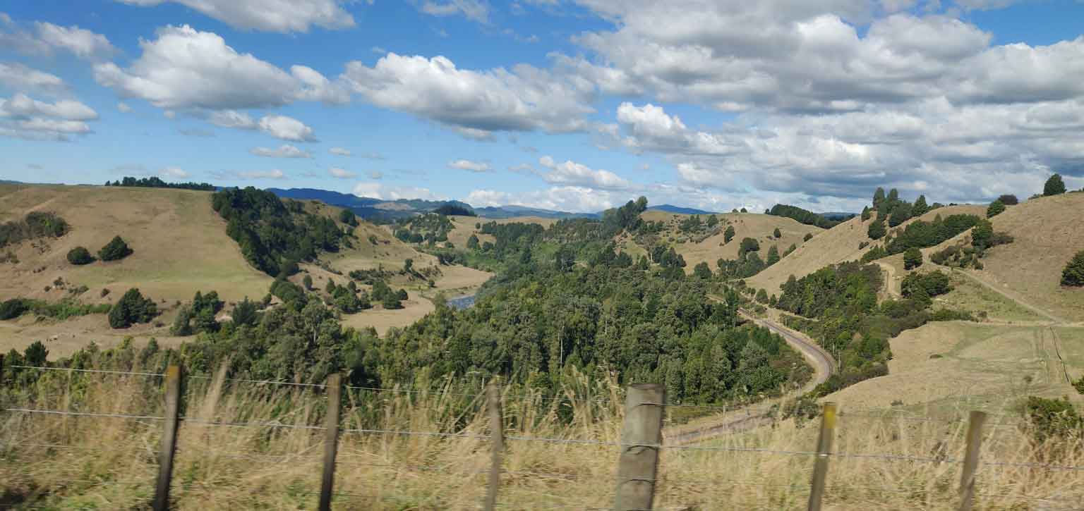 Nous voilà partis ! On est déjà heureux, les paysages néo-zélandais, même de la route, sont vraiment superbes. On dirait qu’un enfant a dessiné son idée de la campagne, puis froissé un peu le dessin pour faire du relief : des collines verdoyantes à n’en plus finir, le ciel bleu, des moutons blancs dans le ciel et beige dans l’herbe, une maison de temps en temps, et c’est tout. On est bien. 🙂