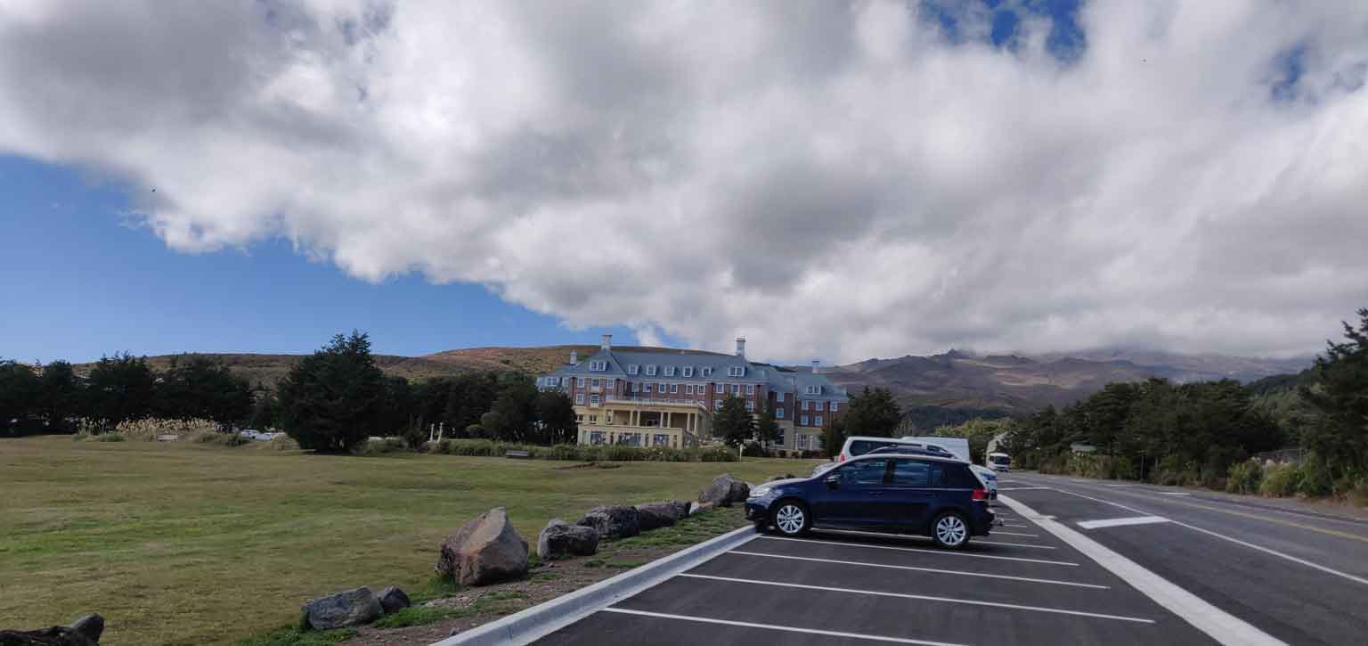 Premier jour : dur dur le réveil… Après avoir terminé les sacs, on passe à côté de l’hôtel très classe « Château Tongariro » 😛 pour aller au centre visiteur du parc (bien organisé, avec même une petit expo !) pour vérifier nos informations. On tombe sur un maori hyper gentil qui nous explique qu’il y a peut-être moyen de faire la grosse journée le premier jour malgré les réservations, car souvent des gens changent leurs plans et libèrent des places dans les refuges. On ne pensait pas que ce serait possible, du coup on est parti un peu tard… Tentons quand même !