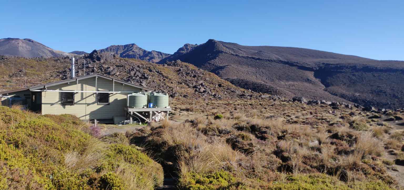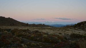 Ensuite on ressort de l’autre côté de la colline, et le paysage devient plus aride, plus lunaire. On se rapproche du volcan et on se fait plaisir avec quelques photos, même si Camille commence à avoir mal aux pieds comme ça ne lui est jamais arrivé et que Romain ne sent plus ses cuisses 🤣. Le jour tombe petit à petit, mais le chemin n’arrête pas de descendre et remonter et on fatigue un peu 😊. Le soleil disparaît derrière le volcan, les couleurs sont magnifiques mais la lumière baisse très vite… et on arrive au refuge Oturere piiiile poil quand la nuit arrive, à 20h (donc on a bien mis trois heures comme on avait vu et pas deux heures et demi comme le disait le ranger 😅).