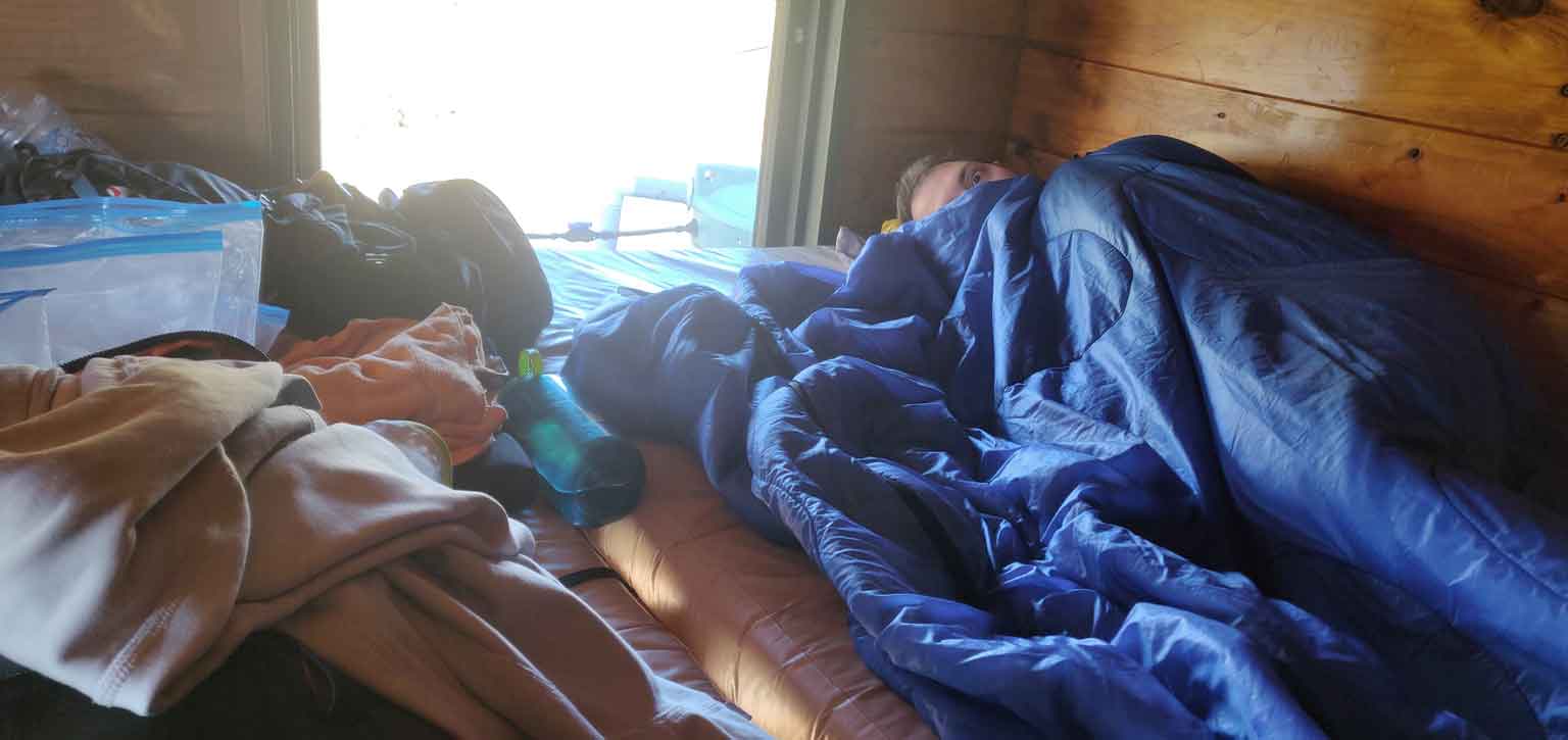 On arrive au camping où on passe la nuit vers 16h30. La température en altitude ne pardonne pas mais on est équipés : Camille se paie le luxe d’une sieste sous un arbre, emmitouflée dans sa doudoune et confortablement installée sur les matelas du van. Puis c’est l’heure de préparer les sacs : nourriture pour les trois jours, vêtements au minimum, et tous les accessoires « au cas où » pour de la balade en montagne. C’est long de penser à tout, d’autant que c’est notre première expérience du genre !