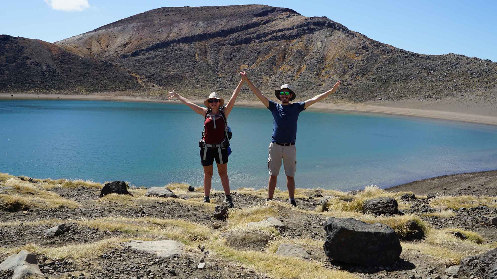 On arrive en haut de la première montée — en passant le col où on voit des colonnes de fumée de soufre, car le volcan est actif ! — avec une première récompense : un lac magnifique, avec des reflets bleus et mauves. On se pose là pour manger, et on voit pas mal de groupes passer de l’autre côté du lac : ce sont les derniers groupes de randonneurs qui font le très fréquenté Alpine Crossing. On les aura très peu vus (une vingtaine sur les deux mille qui ont suivi le chemin ce jour-là d’après la ranger 😯), et on n’en est pas mécontents 😊. On fait un crochet de quarante minutes aller-retour pour aller voir le Blue Lake, puis on s’attaque au dernier morceau, le plus costaud, de la montée : le flanc du Red Crater, fait de roche et terreau volcanique, qui roule et s’enfonce sous nos pas. Honnêtement, malgré ce que nous ont dit les gens qu’on avaient croisés, on est contents de l’avoir fait dans ce sens-là ! En donnant des petits coups de pied pour assurer la prise et en se penchant bien en avant, on arrive jusqu’en haut, complètement crevés… mais.