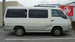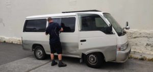 On savait qu’il y avait une vitre cassée sur la droite mais dont le changement était pris en charge par l’assurance de Leah, la propriétaire, donc on n’a rien à faire à part aller au rendez-vous pris pour le jeudi suivant. Ok, super, Romain va faire le transfert de l’assurance AA, formule complète comme ça on est tranquilles.