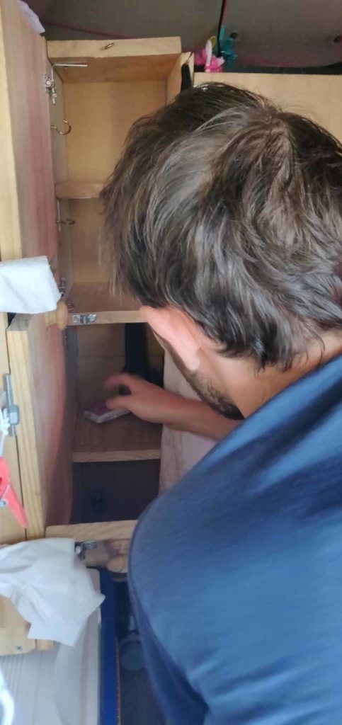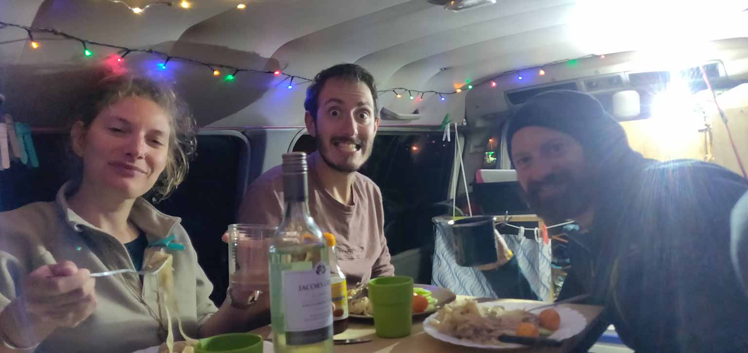 Bon, c’est petit, ça fait mal au dos quand on se tient debout, mais on dort super bien et une fois qu’on aura viré tout le matériel qui ne sert à rien on sera bons. On commence donc à faire ça le mardi, en attendant le rendez-vous pour la vitre du jeudi. On rencontre Norman, un gars super sympa qui nous invite à dîner chez lui avec sa famille le soir même, c’est super chouette on est tout contents.