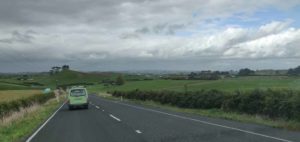 Il teste, apparemment c’est la batterie ; sauf que l’ancienne propriétaire nous dit qu’elle est neuve, c’est bizarre ; donc il y a une possibilité que ce soit l’alternateur qui l’ait fatiguée, mais difficile à savoir comme ça. À priori l’autre batterie en tout cas ne pose pas de souci. Bref, le gars nous dit « pour cinq heures de route jusqu’à Auckland avec l’autre batterie ça le fait » ; pour nous rassurer, il nous laisse le suivre jusqu’à la prochaine ville à vingt-quatre kilomètres et il refait une vérification là-bas. On est encore un peu perdus mais à priori on va tenter Auckland (pas trop le choix). On prend de l’essence et passe faire des courses.