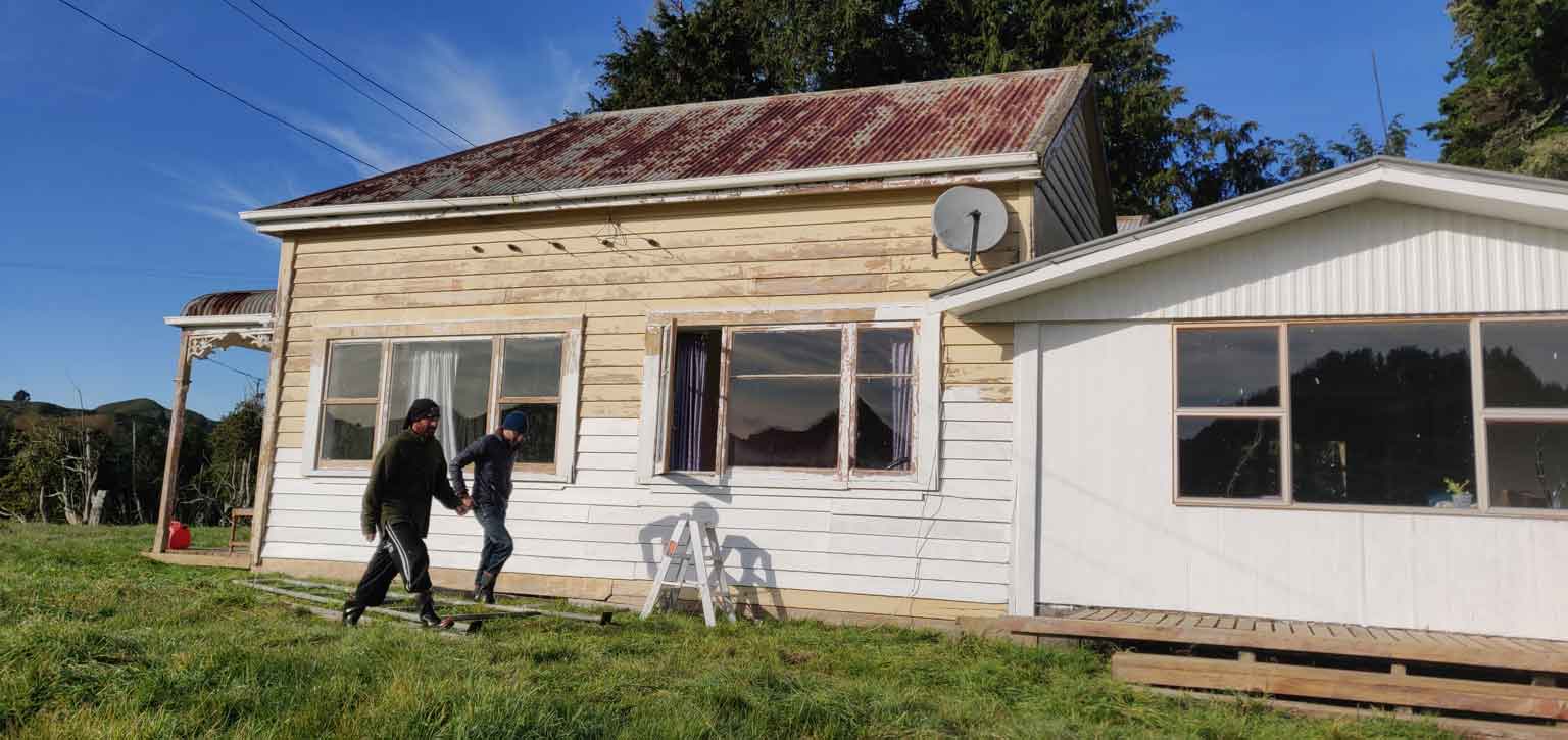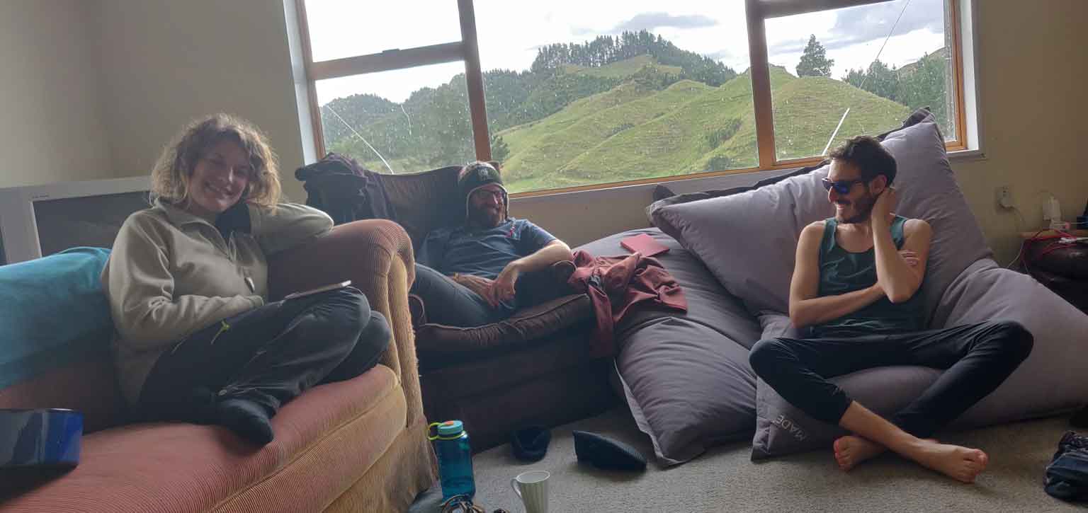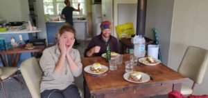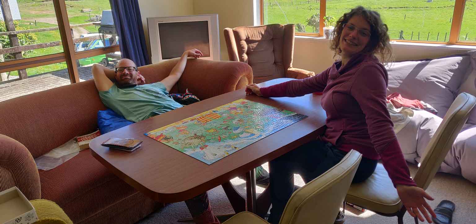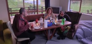 Nous habiterons tous les quatre ici, le temps que le confinement durera, soit deux mois. Nos deux vans sont gentiment garés devant la maison, et on commence par un grand ménage : la maison est la plupart du temps inhabitée, et il y a de quoi faire 😁 . Après un petit temps d’adaptation, nous prenons nos marques : chaque couple a sa chambre, il y a un grand salon avec cuisine américaine, une salle de bains, des toilettes, et une machine à laver, bref tout ce qu’il faut ! Le seul bémol, c’est que la maison est très froide (ici, c’est le début de l’hiver…) et que le poêle ne fonctionne pas, mais John veille au grain et nous amène quantités de couverture et deux petits chauffages électriques qui serviront beaucoup ! Notre ange gardien du bout du monde. 😊