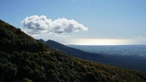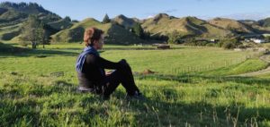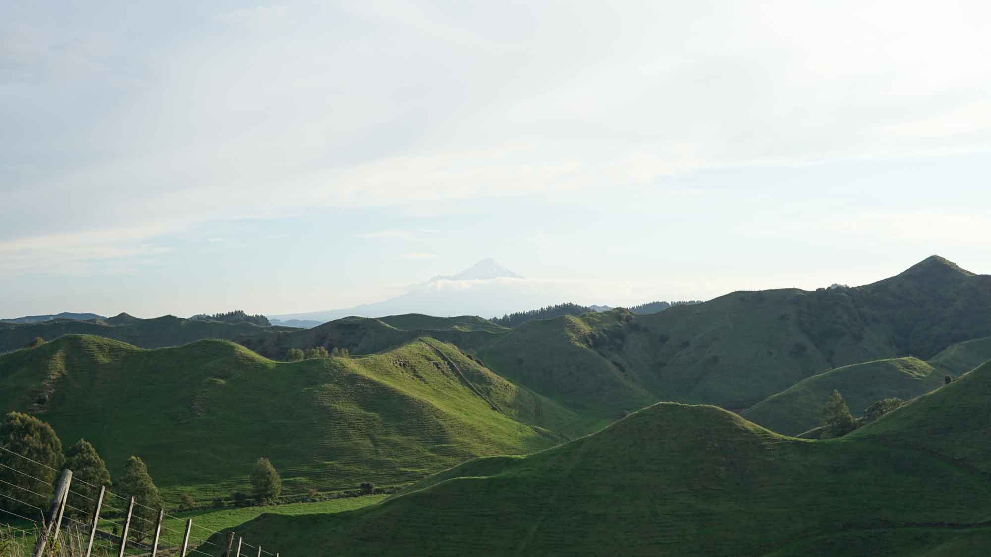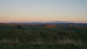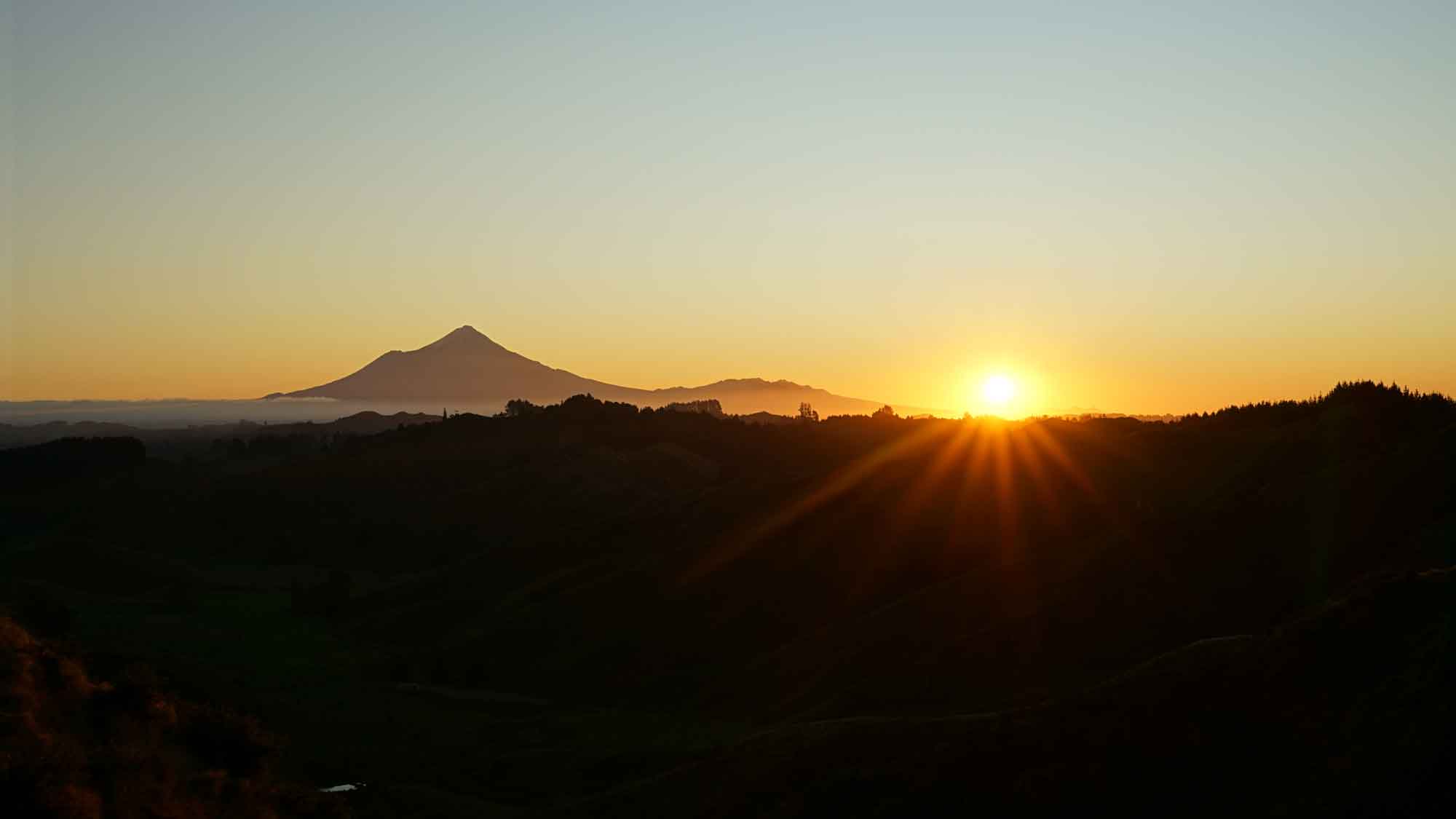 On vous rassure, on n’a pas passé les deux mois enfermés : comme le terrain autour de la maison est un terrain privé, on pouvait se balader librement, et on en a bien profité. En montant sur une colline à l’ouest de la maison, on avait une vue magnifique sur le mont Taranaki, le volcan qui donne son nom à la région, et le soleil qui se couchait à côté de lui.