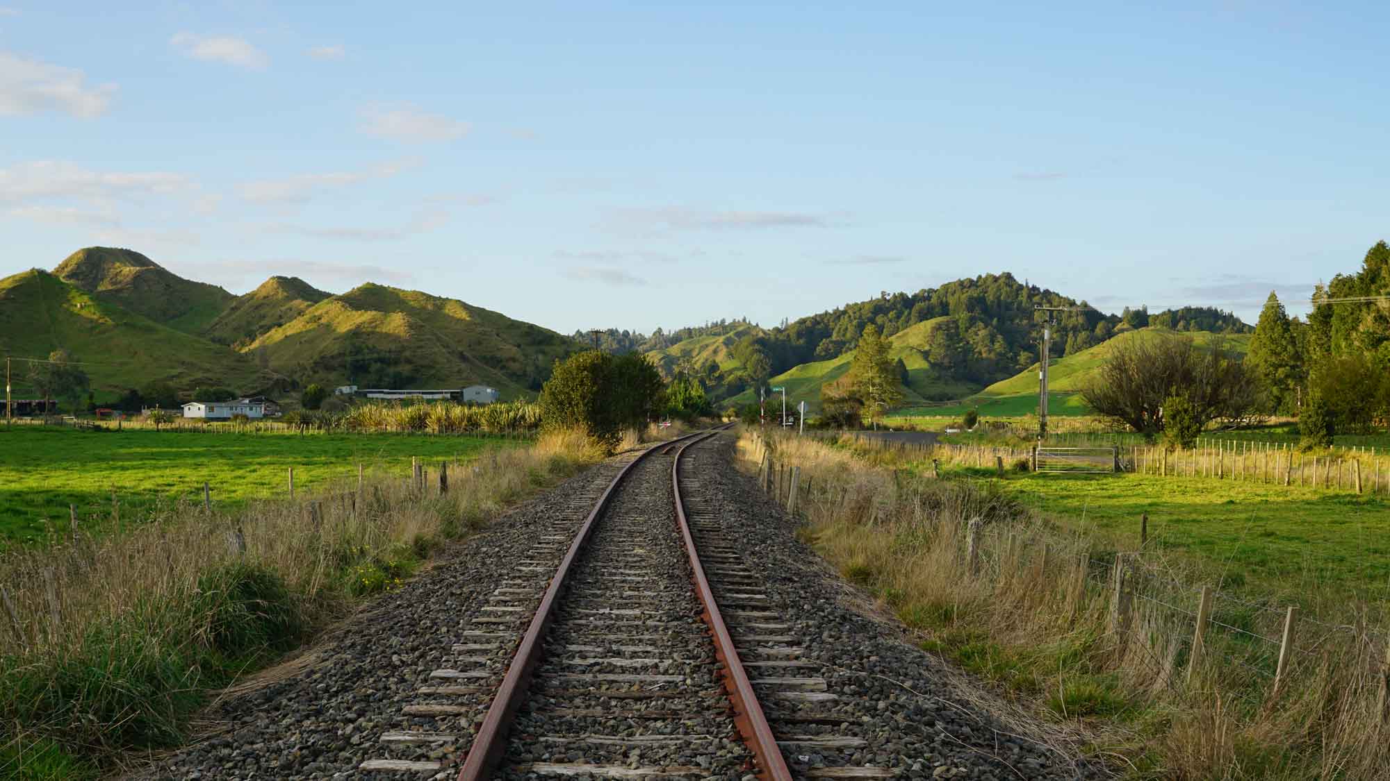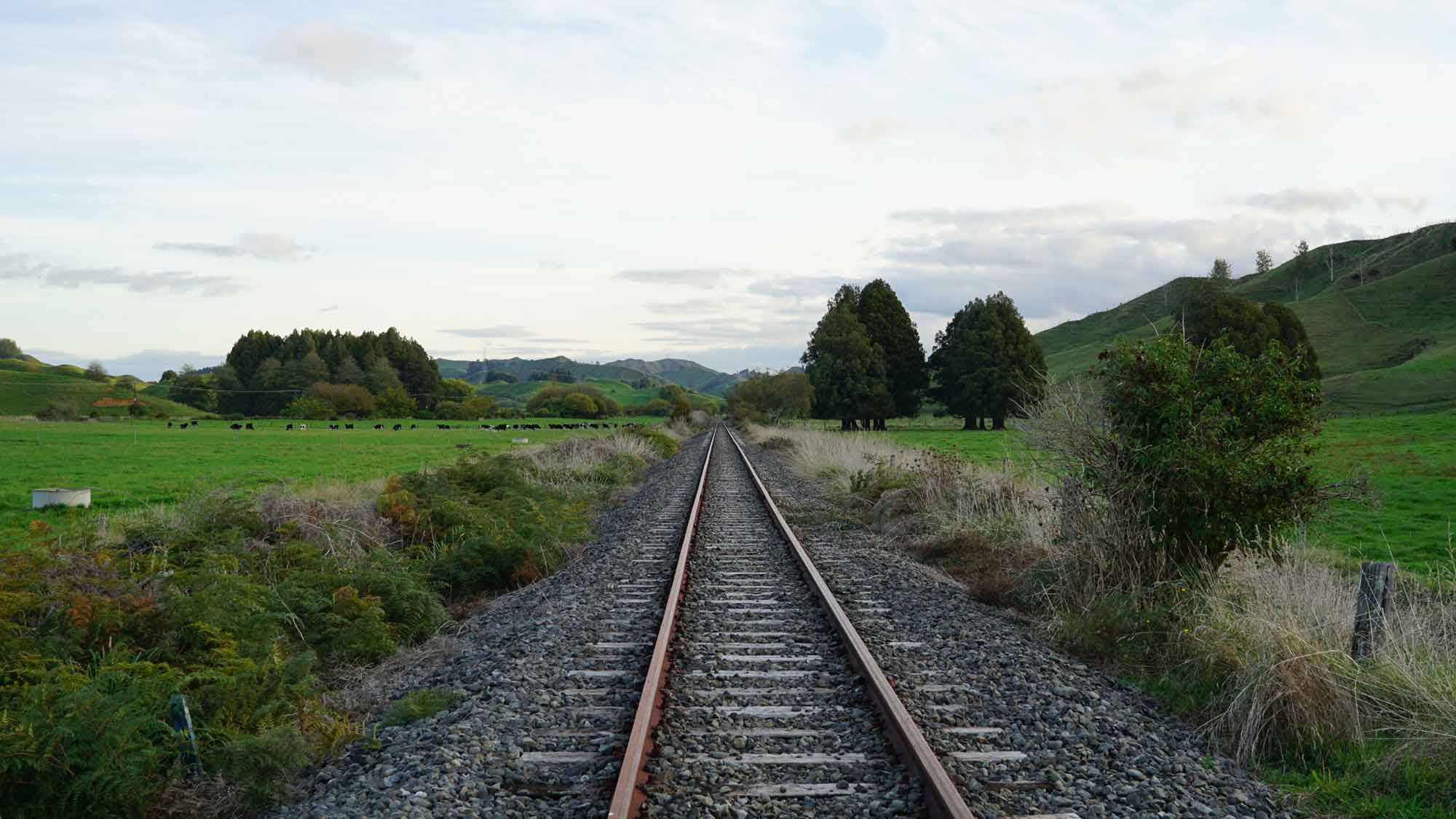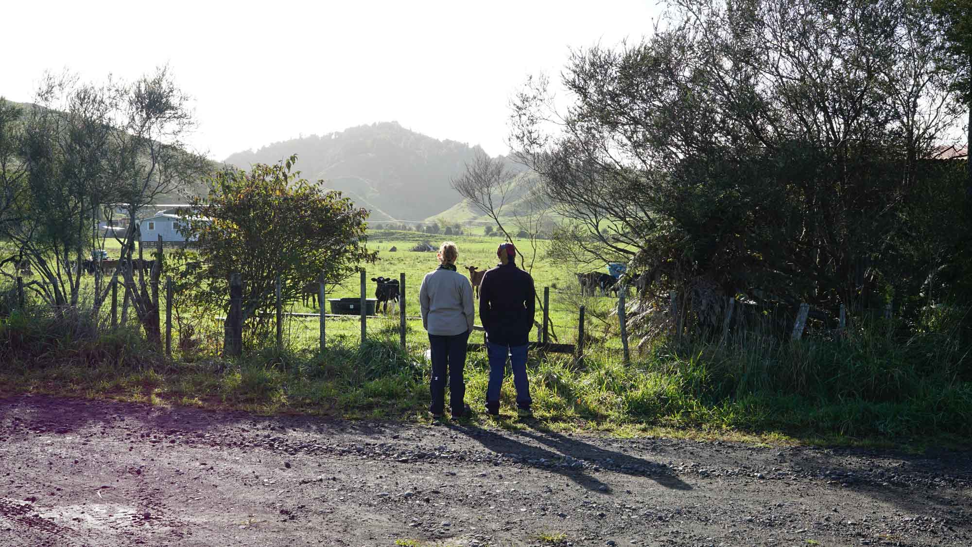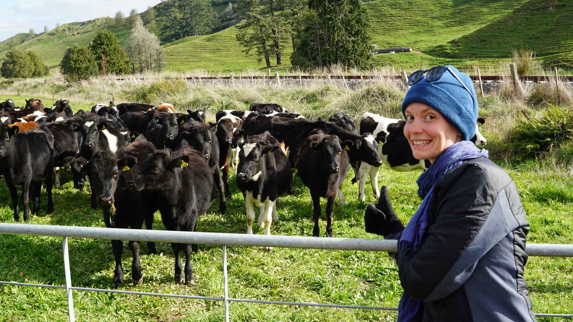 À l’est de la maison, pas loin de la route, il y a une ligne de rails abandonnés, qui servaient il y a longtemps à transporter des wagons de marchandises de la campagne vers la ville de New Plymouth, tout à l’ouest. Nigel, notre voisin tout rond et adorable, de son accent kiwi incompréhensible, nous raconte que le long tunnel que parcourait les wagons était tellement sombre que pour savoir si le train avançait dans le bon sens, le conducteur tendait un bâton pour toucher les bords du tunnel. Nous, on se contente de faire l’équilibre sur les rails, regarder les martins-pêcheurs perchés sur les lignes électriques et les veaux dans les champs autour qui jouent et cabriolent dans tous les sens.