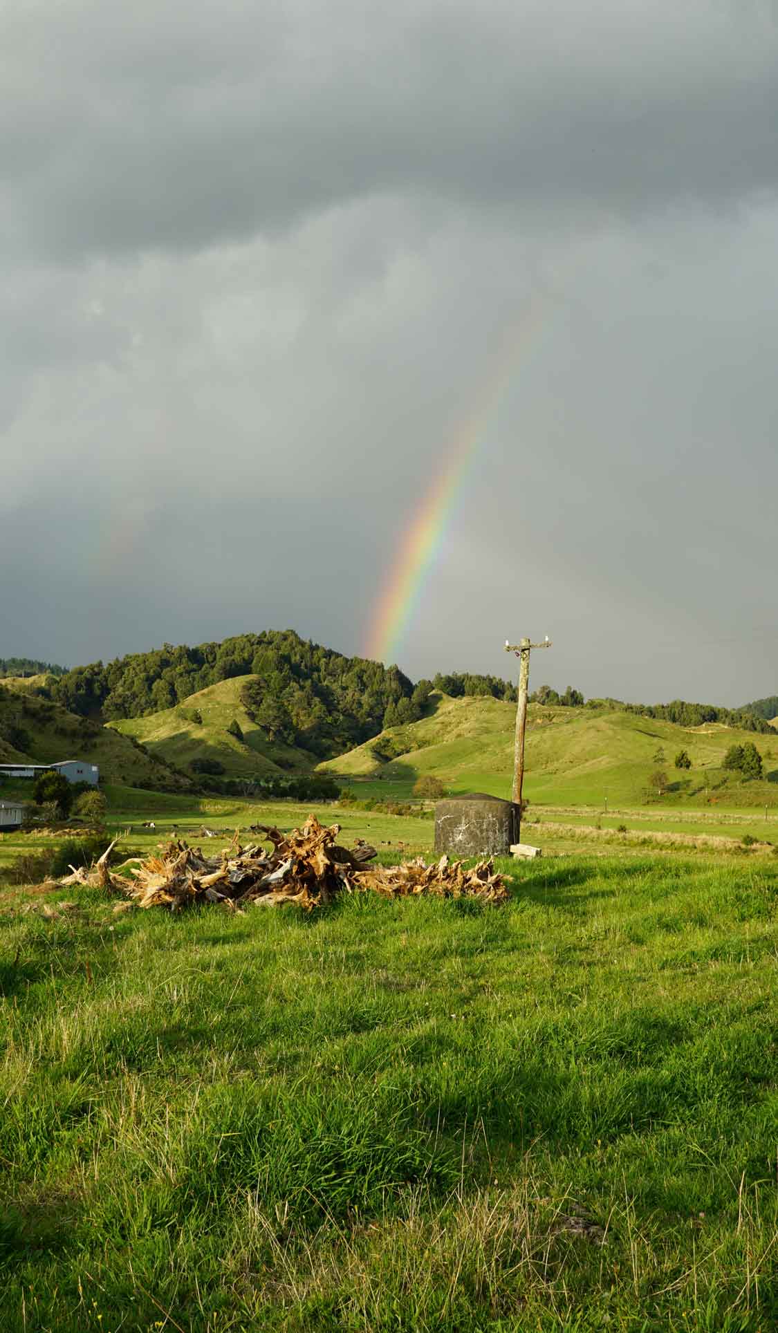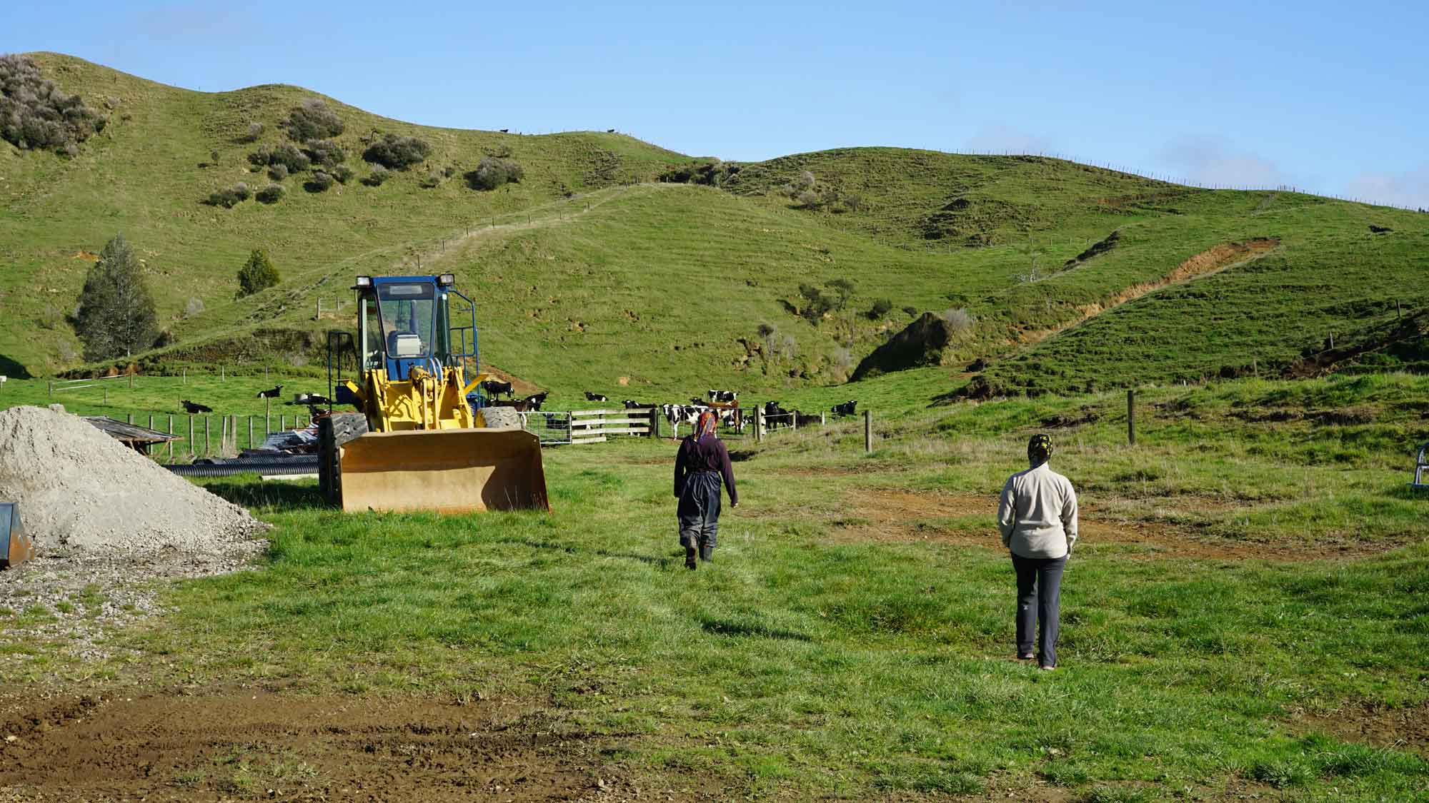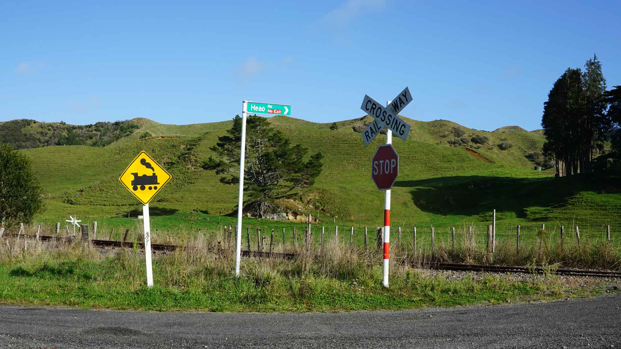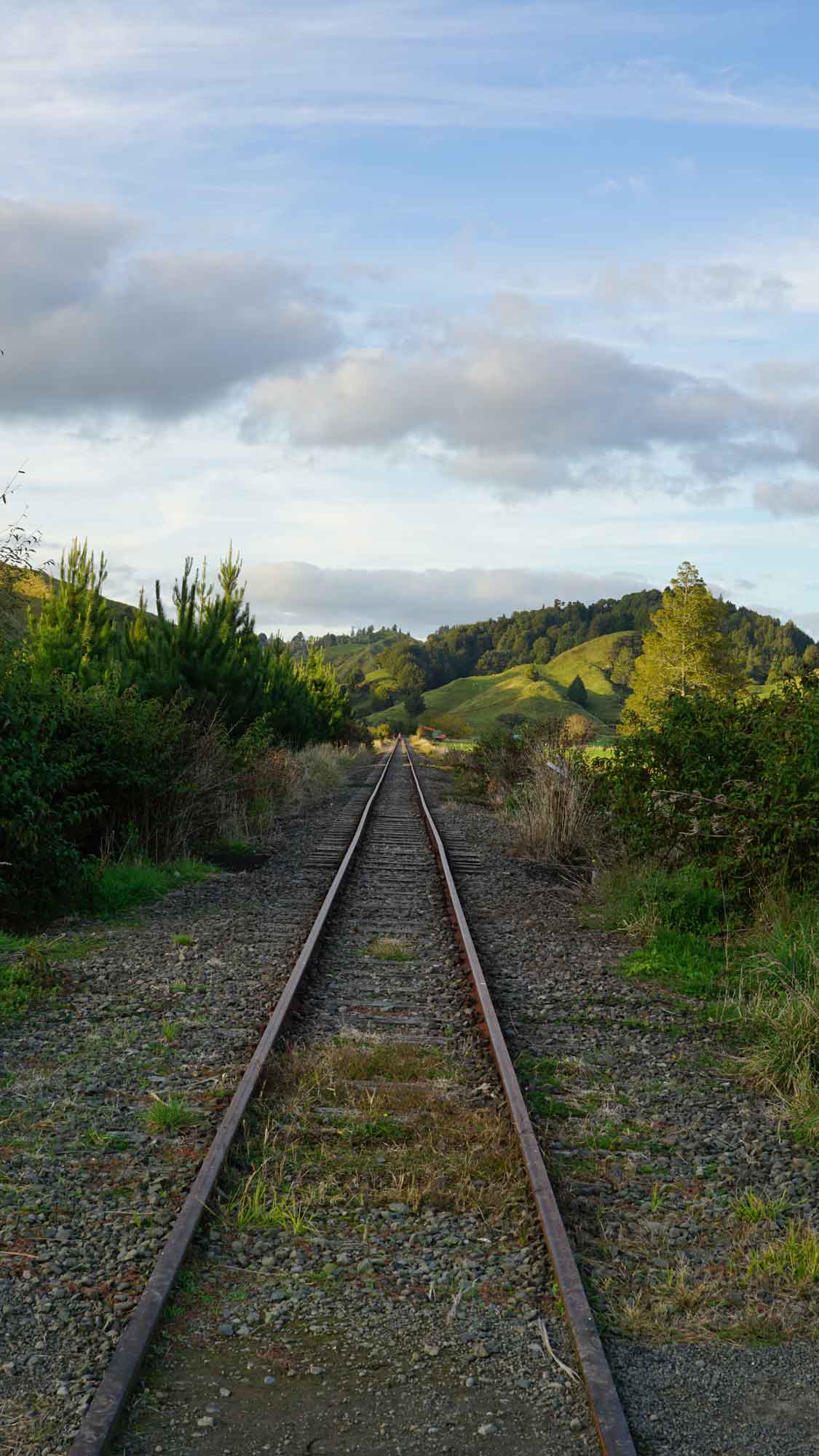 À l’est de la maison, pas loin de la route, il y a une ligne de rails abandonnés, qui servaient il y a longtemps à transporter des wagons de marchandises de la campagne vers la ville de New Plymouth, tout à l’ouest. Nigel, notre voisin tout rond et adorable, de son accent kiwi incompréhensible, nous raconte que le long tunnel que parcourait les wagons était tellement sombre que pour savoir si le train avançait dans le bon sens, le conducteur tendait un bâton pour toucher les bords du tunnel. Nous, on se contente de faire l’équilibre sur les rails, regarder les martins-pêcheurs perchés sur les lignes électriques et les veaux dans les champs autour qui jouent et cabriolent dans tous les sens.