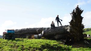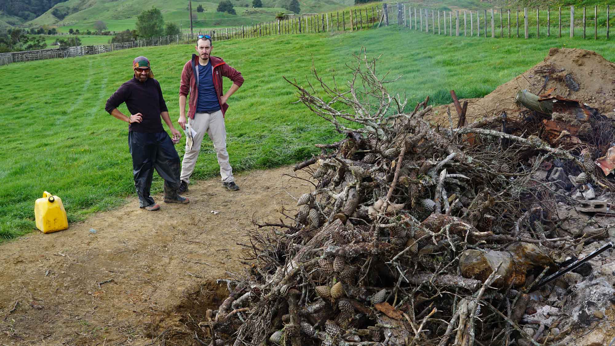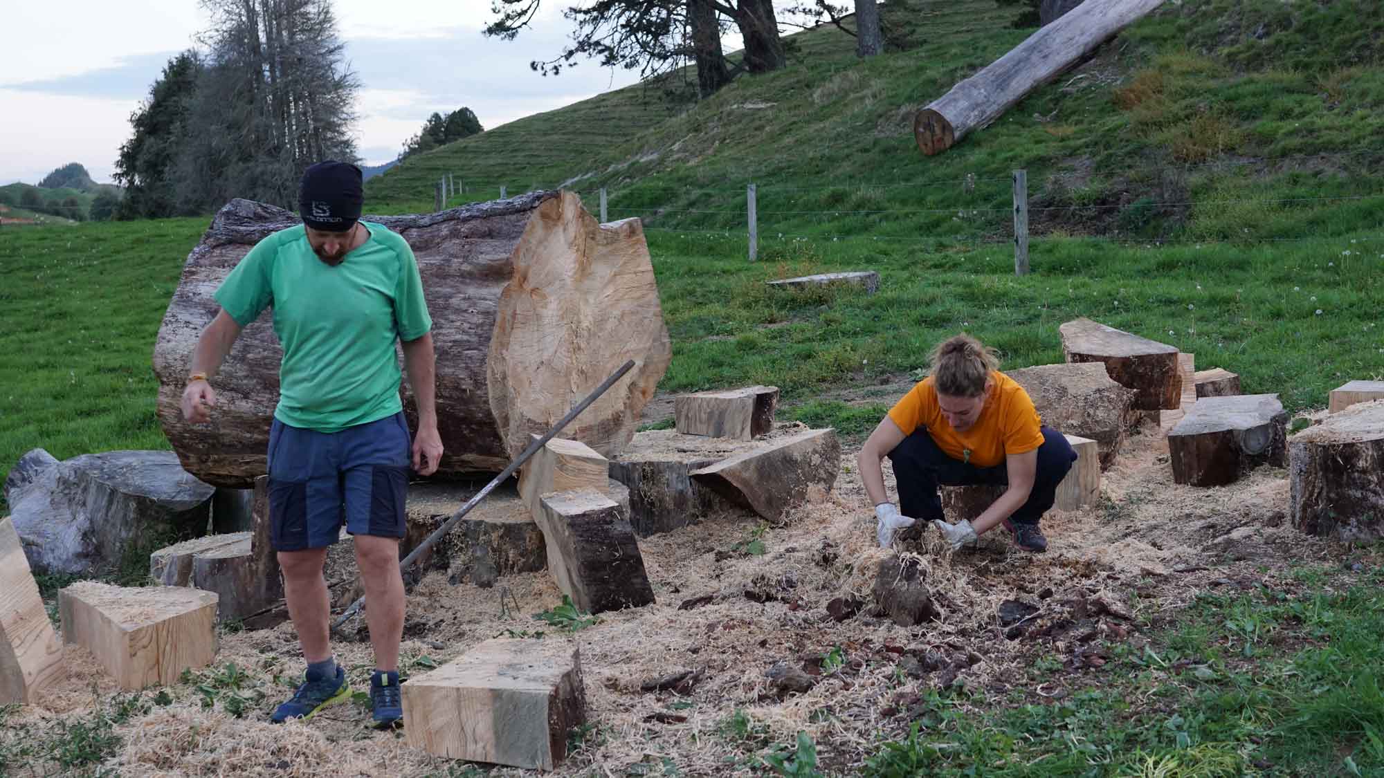 Une des tâches principales consiste à récupérer le bois des arbres morts du terrain et le déplacer pour le brûler. Ça prend du temps, mais on s’amuse bien avec les milliards de pommes de pins tombées en même temps que l’arbre.