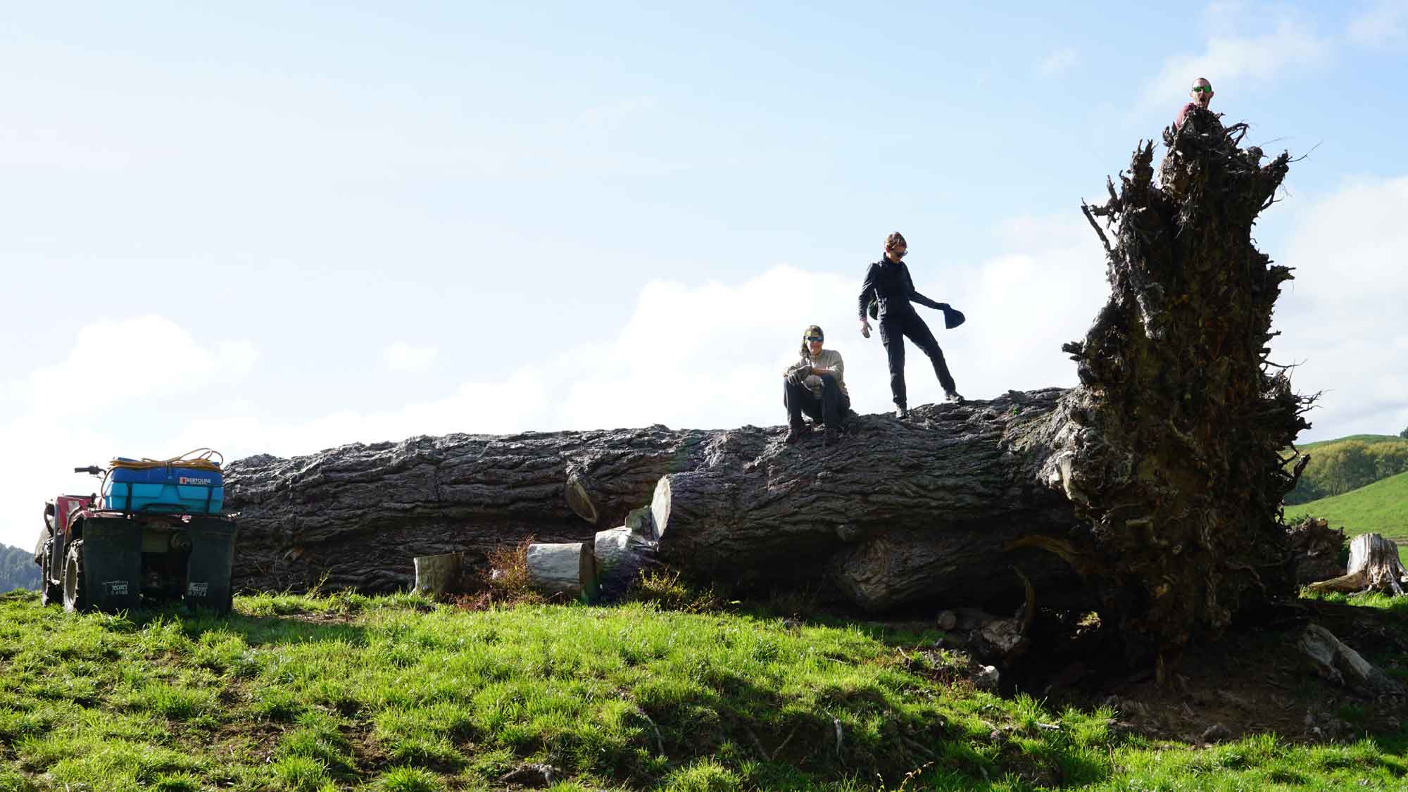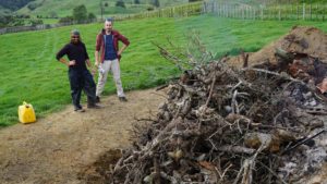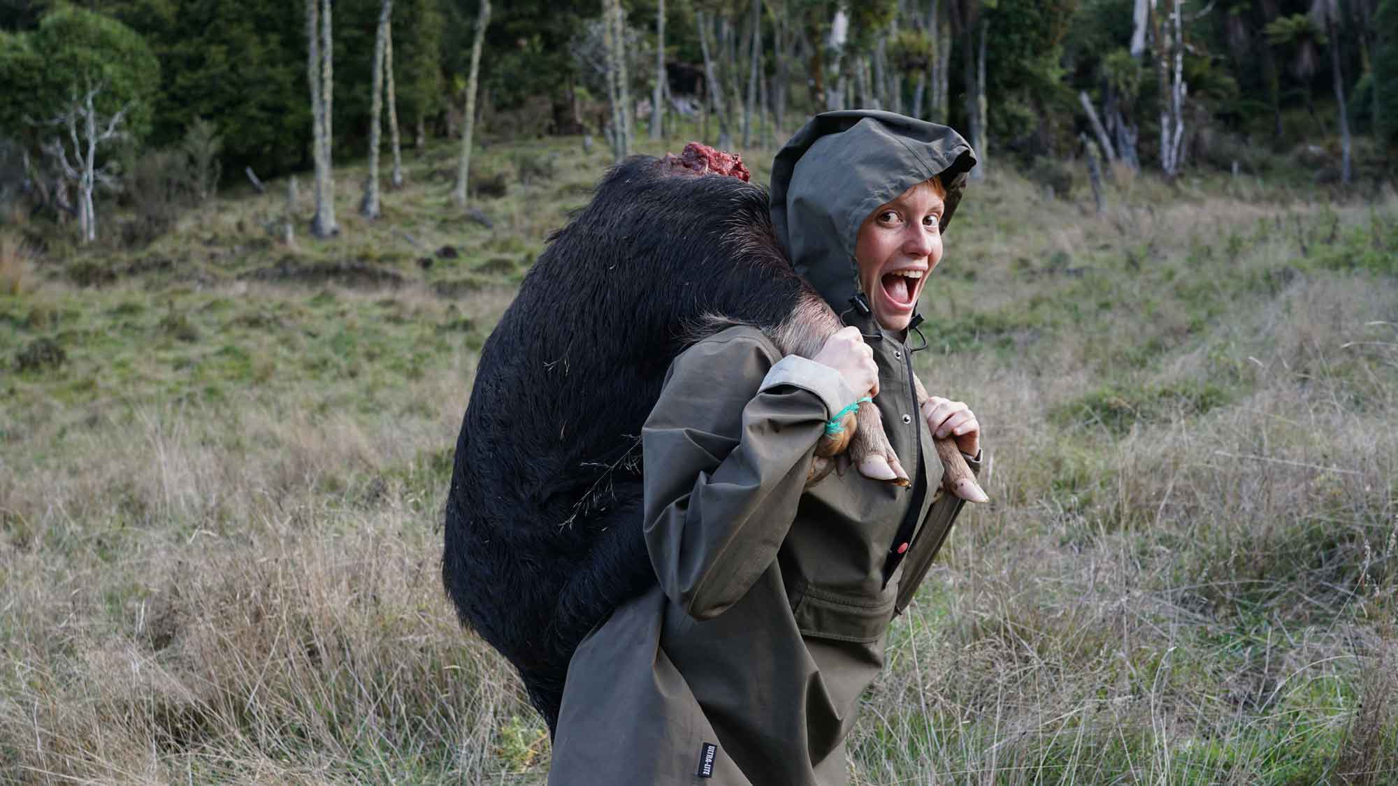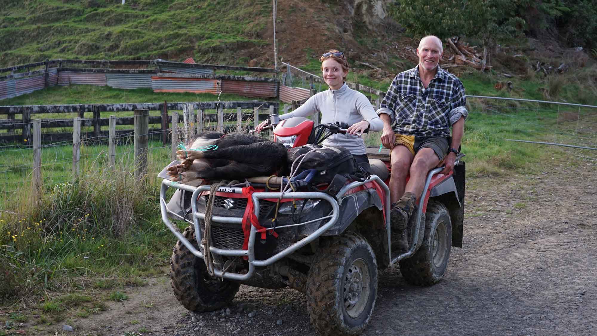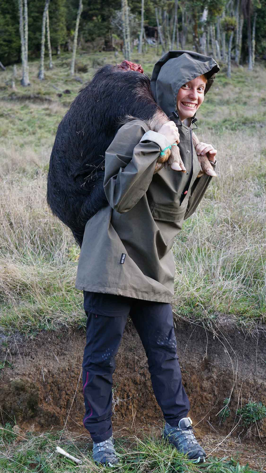 Camille a eu une expérience « 100% campagne néo-zélandaise » : un jour, un voisin d’une ferme assez loin est passé pour nous dire que dans sa séance de chasse il avait abattu un sanglier qu’il allait devoir transporter jusqu’au quad. On l’a donc accompagné avec Juan et Sara, et Camille a transporté sur quelques dizaines de mètres le sanglier, 44kg sur son dos. Ah oui, et il n’avait plus de tête (c’est lourd et ça encombre). Ce qui a donné des photos… intéressantes. 😁
