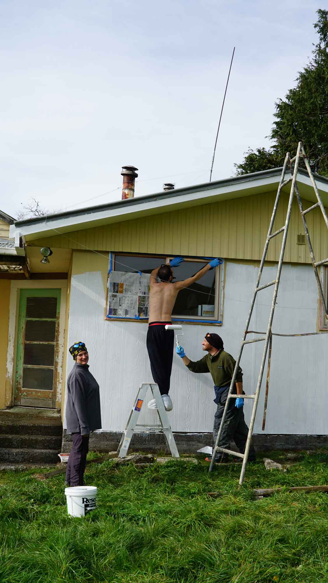Enfin, un des projets de John était de repeindre la maison. Entre deux jours de pluie, les matins de brume et les soirs glacés (à 17h, dès que le soleil passait derrière la colline, la température chutait en dix secondes…), nous avons donc karcherisé, raboté, poncé, et peint les murs extérieurs 😀. Enfin, commencé, puisque nous sommes partis de la maison avant d’avoir fini.