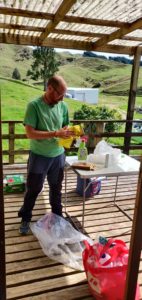 Après deux semaines de confinement, John a eu de gros soucis de santé et a dû être hospitalisé (heureusement, depuis ça va beaucoup mieux). C’est donc ses deux filles Nathalie et Stéphanie, qui ont pris le relais et ont confié davantage de tâches à Juan, notamment le déplacement des vaches d’un champ à l’autre tous les deux jours pour contrôler l’herbe qu’elles broutent. On a assisté en les encadrant quand elles devaient aller loin, c’était bien drôle (et pas toujours simple !). On a eu l’occasion de réparer une clôture que des nouveaux arrivants un peu trop vaillants avaient défoncée. 😆