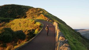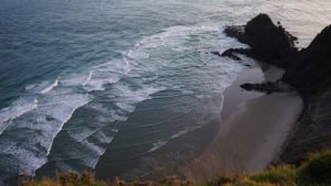 On émerge, et on descend sur un chemin avec une vue magnifique sur la mer, les avancées rocheuses après les versants couverts d’herbe, et une plage en contre-bas qui doit être bien inaccessible. Ce petit chemin du bout du monde mène jusqu’à un phare, on se croirait en Bretagne. 😄