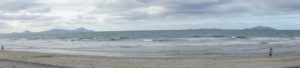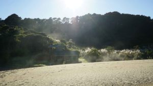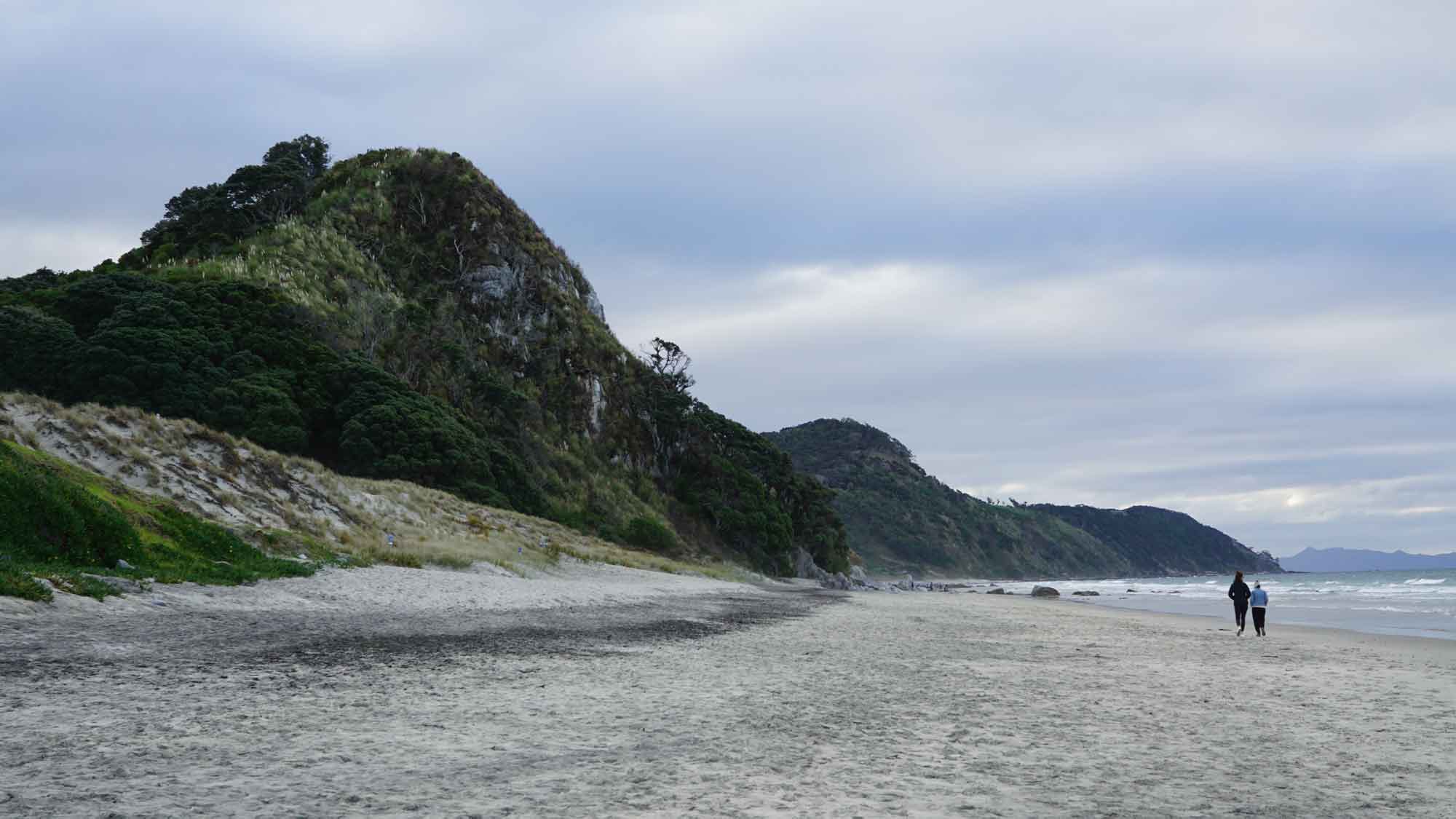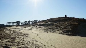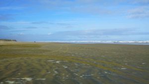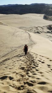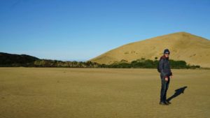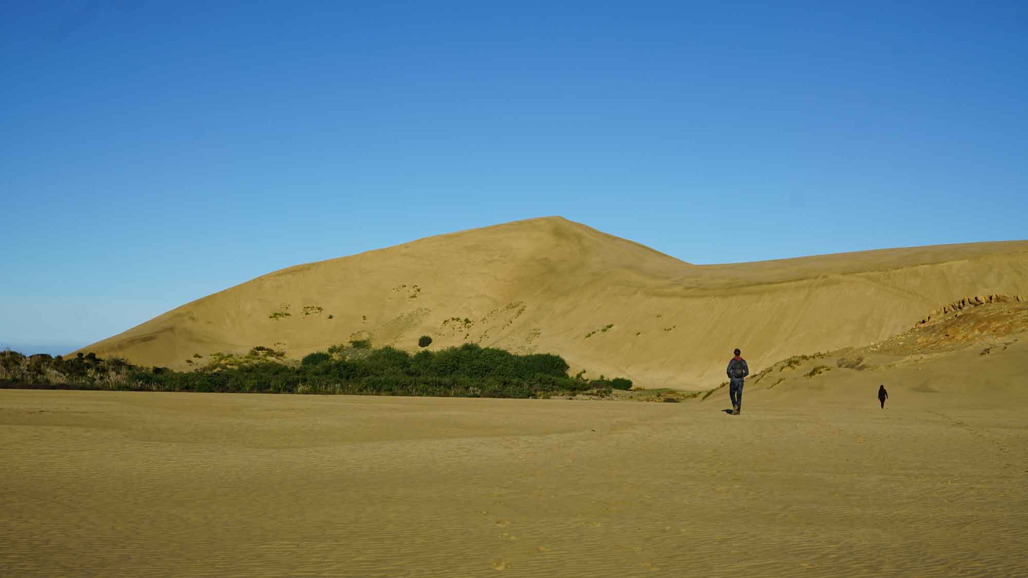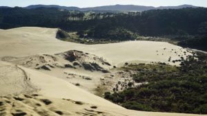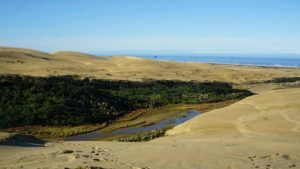 Étape suivante : les dunes géantes de sable de Te Paki. Les blasés diront que c’est comme Arcachon ; bon, c’était un peu plus grand quand même 😊… Petit paysage lunaire en y arrivant. Romain a la flemme, mais Corneli et Camille montent jusqu’au sommet pour voir la mer. C’est beau ! Il y avait même un stand pour louer des luges de sable, mais on y était trop tôt pour qu’ils aient ouvert. 😛