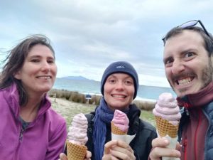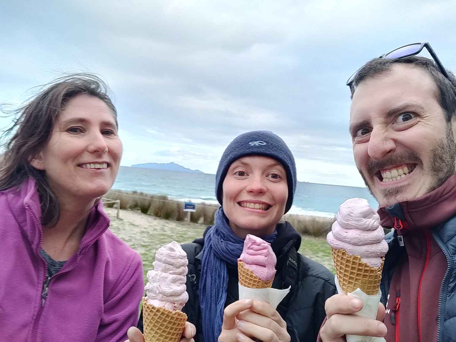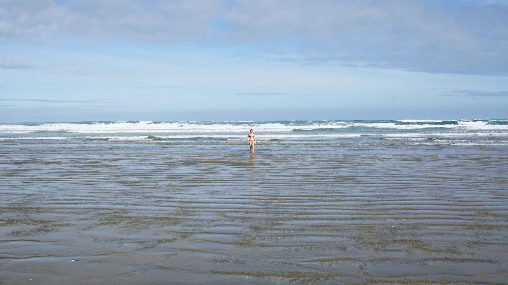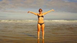 On continue la journée (Camille fait notamment sa petite séance de conduite à gauche pour soulager un peu Corneli qui a conduit la veille), et on arrive au point suivant : la Ninety Mile Beach, une plage immense de quatre-vingt-dix kilomètres de long 😱. La grande mode étant de rouler SUR la plage avec son van ou voiture. On est restés sages, et seule Camille s’est baignée, mais c’était le bonheur ! Il faut penser aussi qu’on sortait à peine du confinement, donc il n’y avait per-sonne.